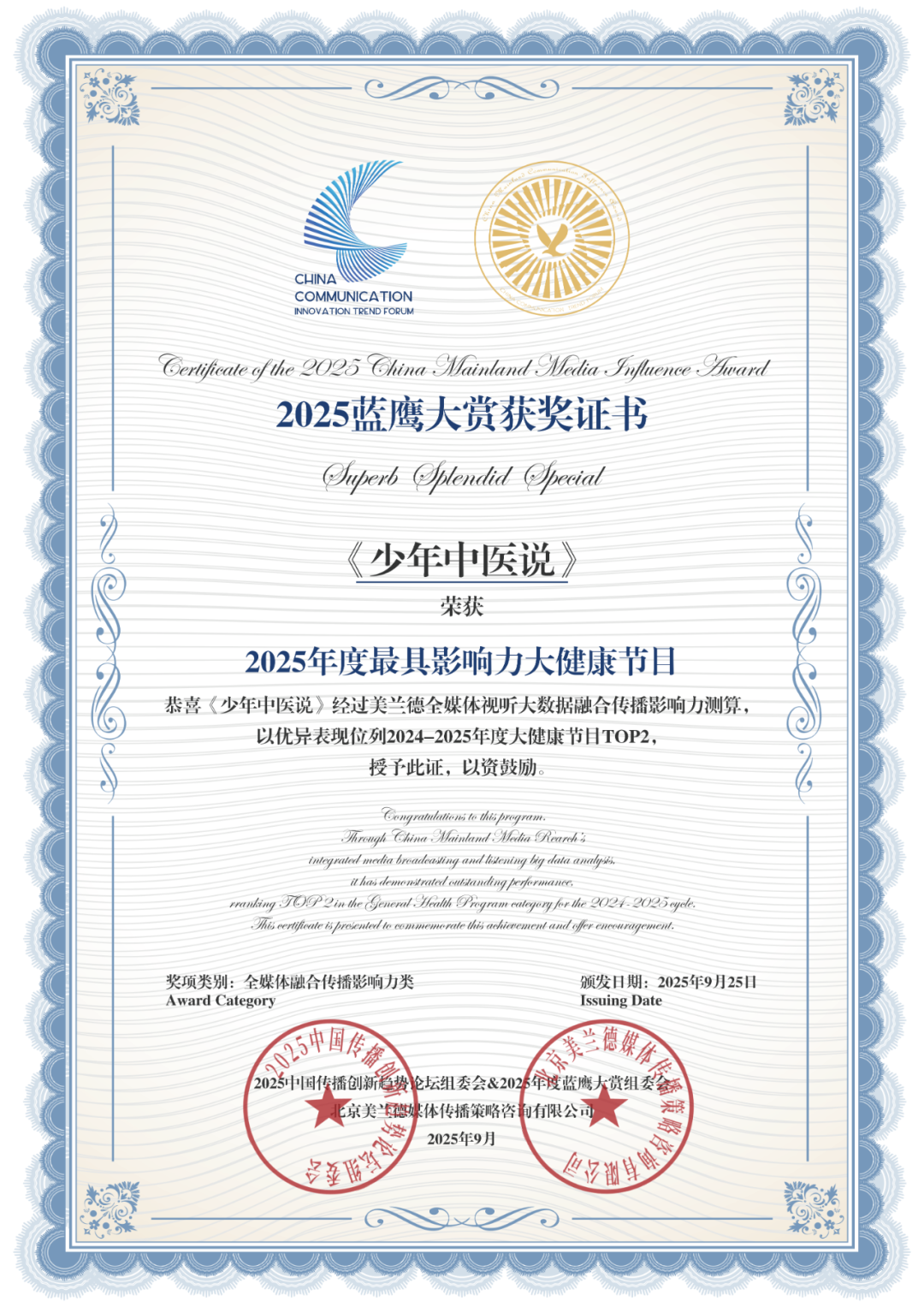 《少年中医说》获“2025年度最具影响力大健康节目”。