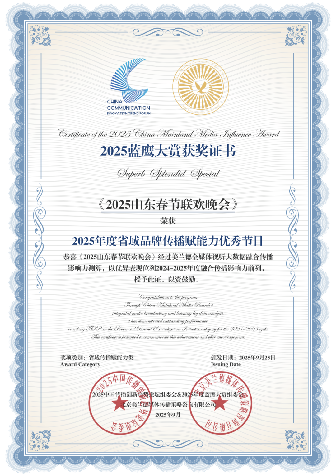 《2025山东春节联欢晚会》获“2025年度省域品牌传播赋能力优秀节目”。