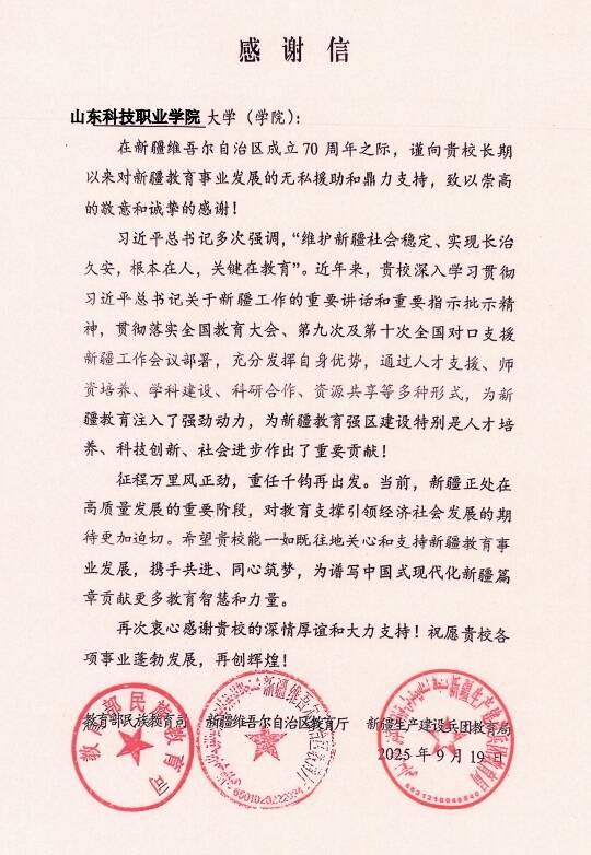齐鲁网·闪电新闻9月28日讯 近日,山东科技职业学院收到由教育部民族教育司、新疆维吾尔自治区教育厅、新疆生产建设兵团教育局联合发来的感谢信。这封跨越近4000公里的信件,既饱含着对学校援疆教师的深深谢意,更体现了对学校长期以来支援新疆职业教育发展的高度认可。