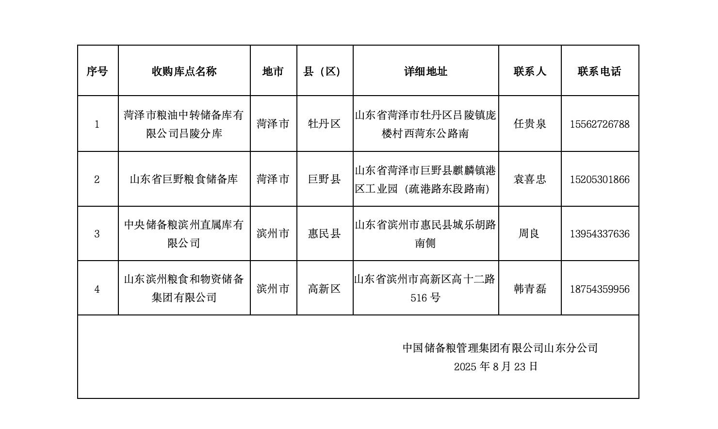 山东三农新闻联播8月23日讯 根据《国家粮食和物资储备局关于在江西山东两省启动2025年最低收购价执行预案的通知》,自2025年8月9日起在山东省内符合条件的地区启动小麦最低收购价执行预案。现将第四批收购库点公告如下: