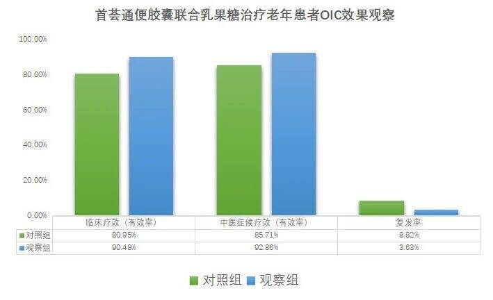 该研究选取84例阿片类药物致便秘的老年恶性肿瘤患者作为研究对象。结果显示:首荟通便胶囊联合乳果糖(观察组)与乳果糖单药(对照组)治疗2周后,观察组临床有效率90.48%、中医证候改善有效率92.86%,均显著高于对照组80.95%、85.71%;且观察组停药4周复发率3.63%,远低于对照组8.82%。