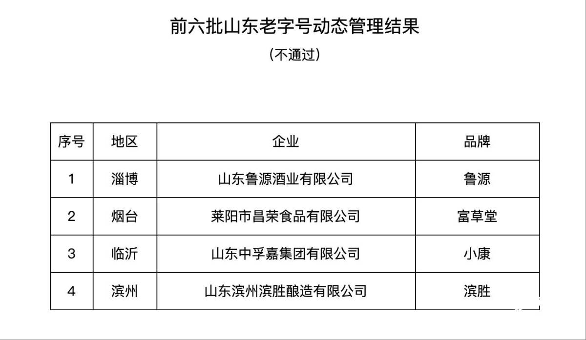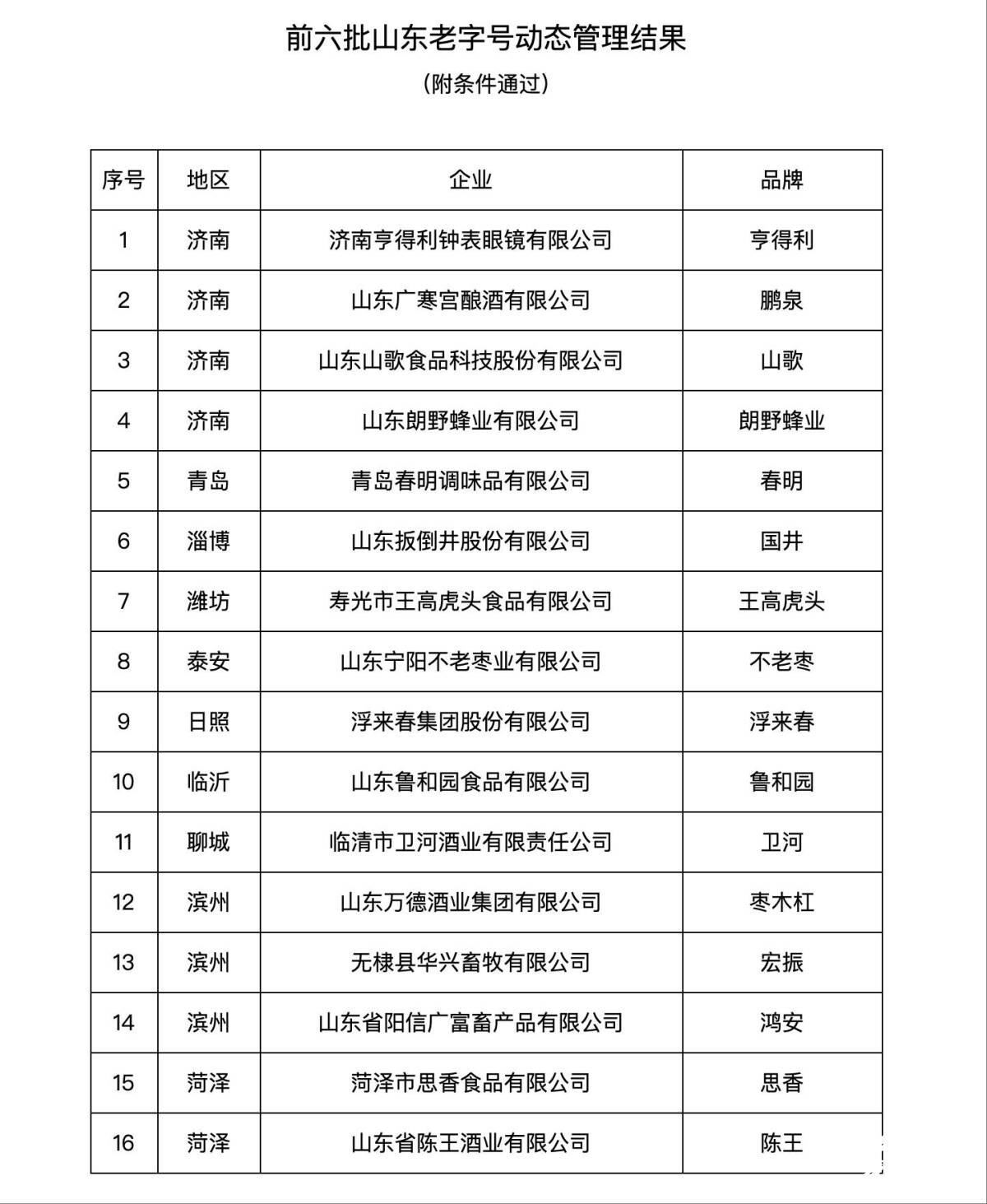 本次动态管理共对255家山东老字号企业开展复核,其中,东阿阿胶股份有限公司等235家企业复核通过;山东山歌食品科技股份有限公司等16家企业附条件通过;山东鲁源酒业有限公司、莱阳市昌荣食品有限公司、山东中孚嘉集团有限公司、山东滨州滨胜酿造有限公司4家企业不通过。
