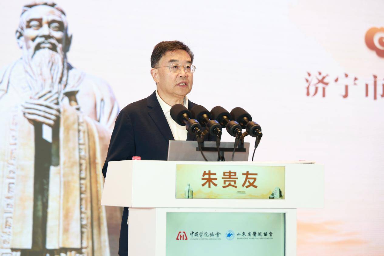 济宁市人民政府副市长、党组成员朱贵友在致辞中表示,济宁作为儒医文化的起源地,自古形成“儒医同源、医儒互鉴”的独特文化生态。儒家哲学思想与中医药诊疗理念深度契合,铸就了中华文明与中医药文化交融共生的璀璨典范。他介绍了济宁在卫生健康领域取得的成就,并表示将以此次大会为契机,积极拓展与中国医院协会、山东省医院协会的合作,着力打造立足山东、辐射全国的医院文化高地。