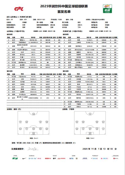 闪电体育11月1日讯 今日15:30,中超第29轮,山东泰山主场收官战迎战天津津门虎。赛前双方的首发阵容出炉,泰山队外援路易斯因伤缺席,王大雷有伤无法出场,孙启航担任首发门将,这是他在泰山队一线队的首秀,天津队外援基莱斯、罗斯和萨尔瓦多首发登场。