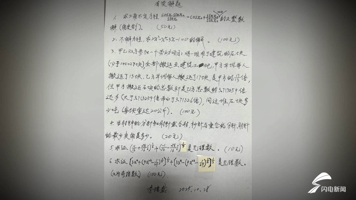“我工资是每个月2200元,拿出来300元,还剩1900元。”算着账的李培盛很乐观。“我感觉写上这个有奖答题,能激励一部分人去解题。”李培盛希望同样爱好数学的网友能够发现新定理,“就是书本上没有的定理或者公式,哪怕发现一个,能告诉我,能跟我交流,我就十分感激,这是我的心愿。”