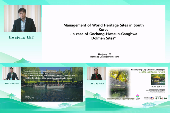 韩国古迹遗址保护协会秘书长KimYoungsoo(金永洙)线上以《韩国文化遗产保护与地方社区冲突化解框架》为题分享韩国百济历史遗迹区、风纳土城、汉阳都城城墙等案例,特别是在遗产保护与城市发展如何兼顾,提出“共存”理念,建议相关政策制定要有包容性举措,遗产保护与现代生活必须实现共存等。马来西亚古迹遗址保护协会理事GohAiTee(吴爱蒂)女士线上以《济南泉·城文化景观洞见与展望》为题为济南泉·城文化景观申遗提出诸多建设性意见,并以2026马来西亚ICOMOS峰会为契机介绍世界遗产申报策略。