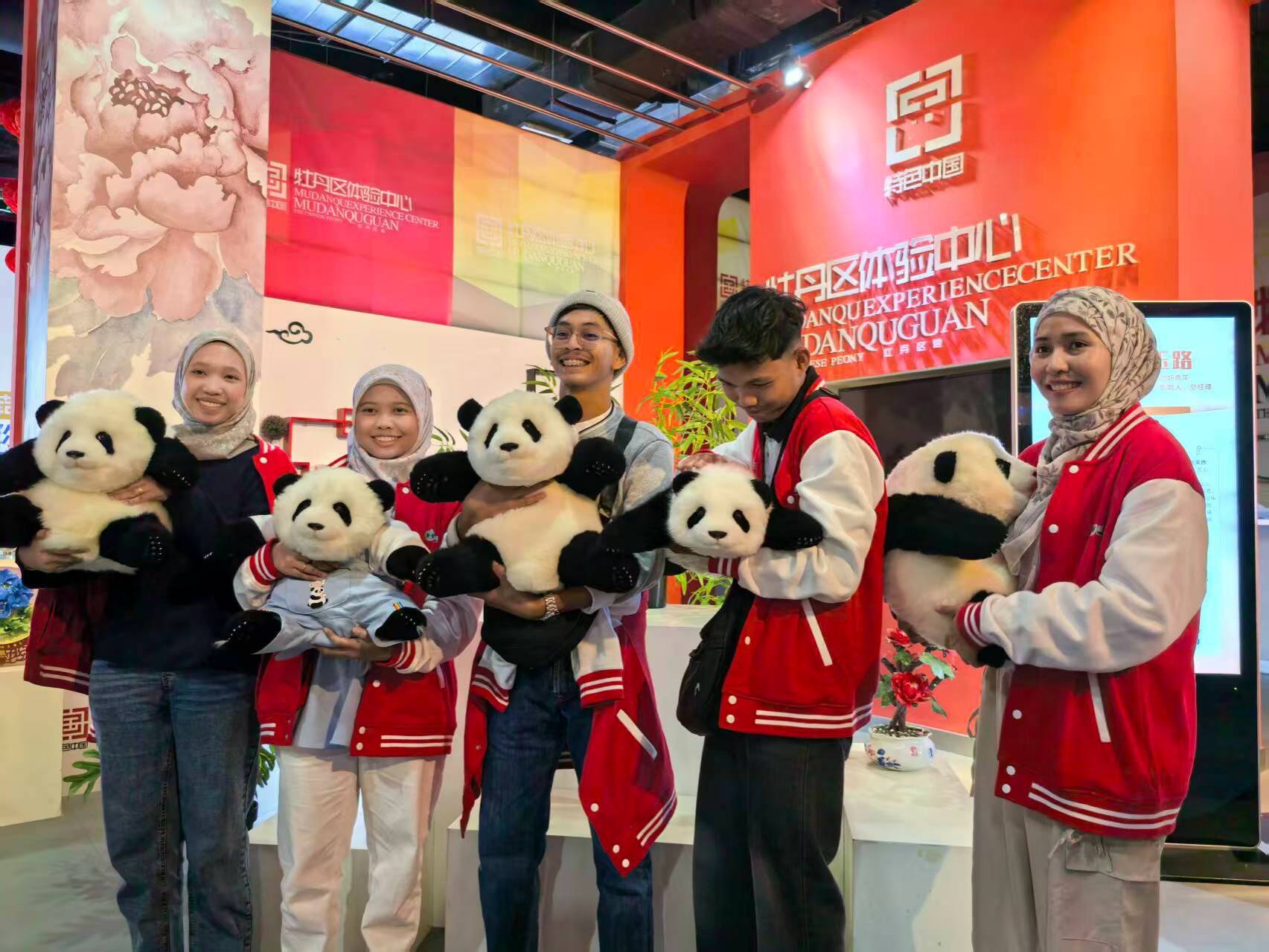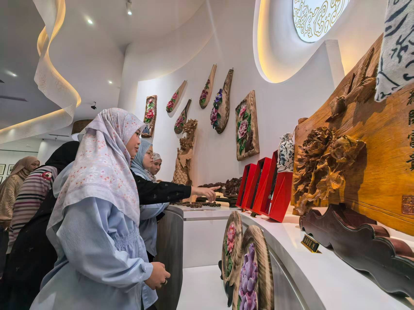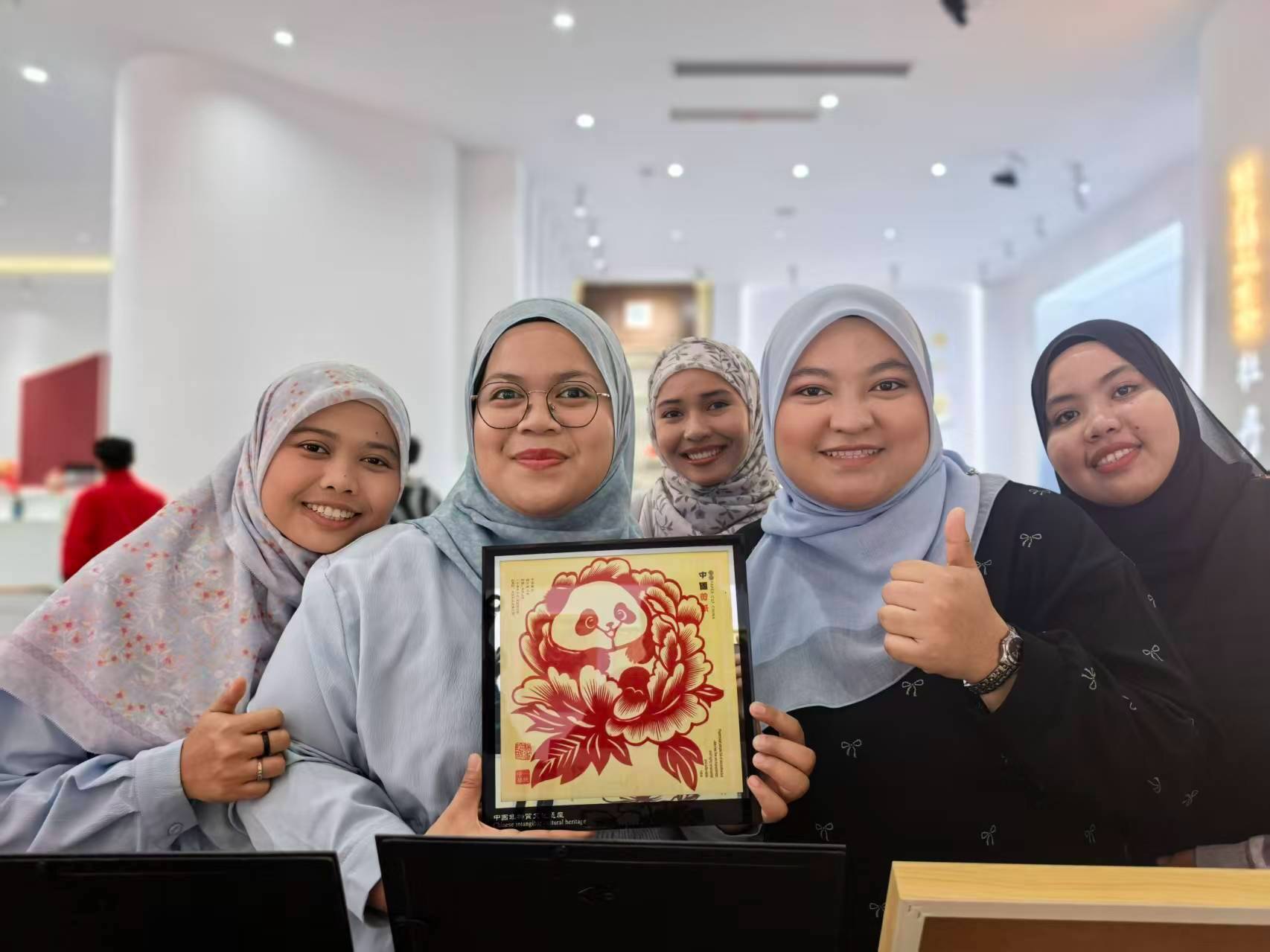 在展厅的盛世芳华馆内,汉服、牡丹瓷、剪纸、工笔牡丹画……一件件富含牡丹元素的菏泽文创产品琳琅满目,散发着浓郁的文化气息。马来西亚师生们穿梭其间,不时拿起精美的文创细细端详,感受着牡丹文化与菏泽传统技艺碰撞出的独特魅力。他们纷纷拿出手机拍照留念,记录下这些充满创意与文化底蕴的瞬间,想要将这份美好分享给远方的亲朋好友。
