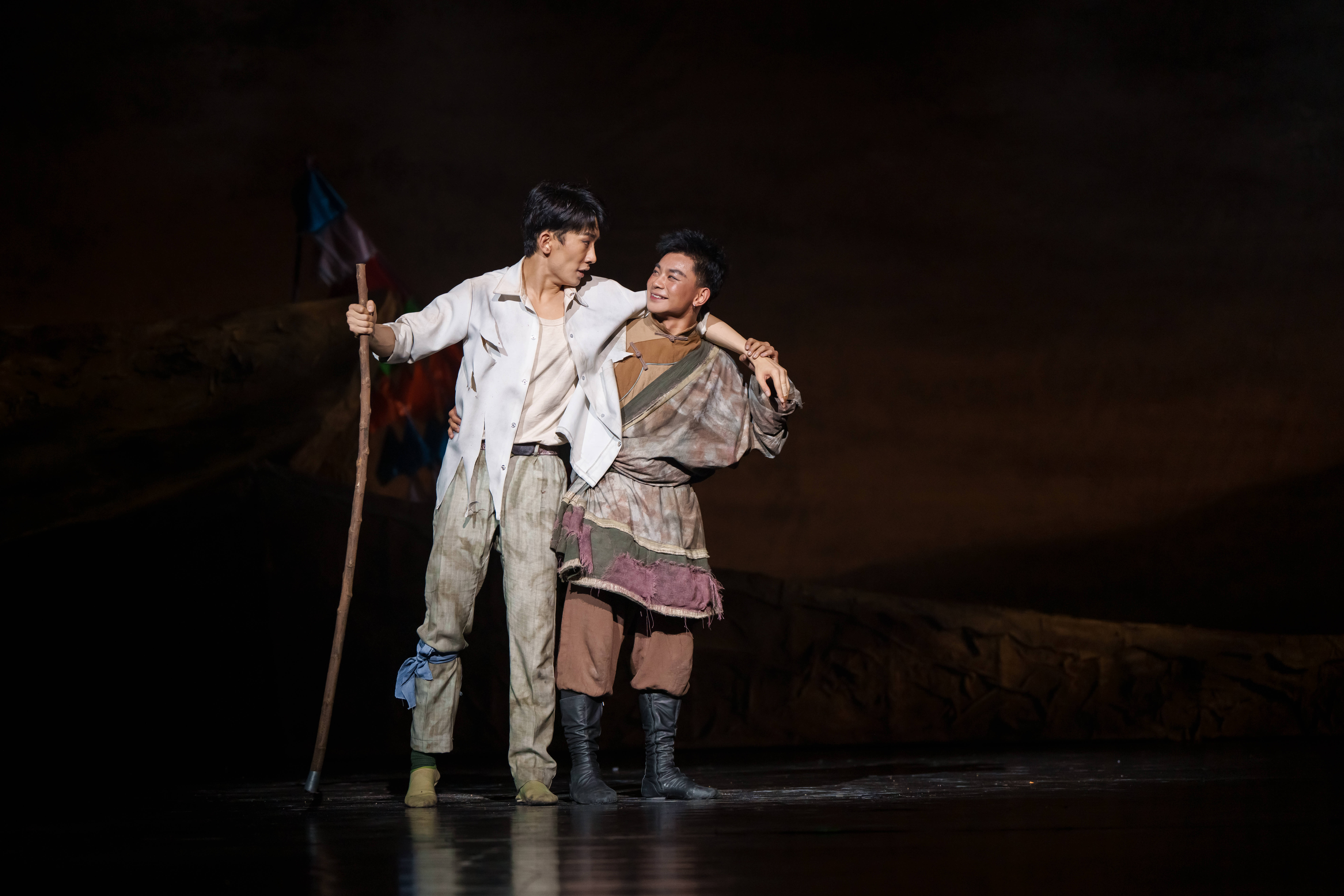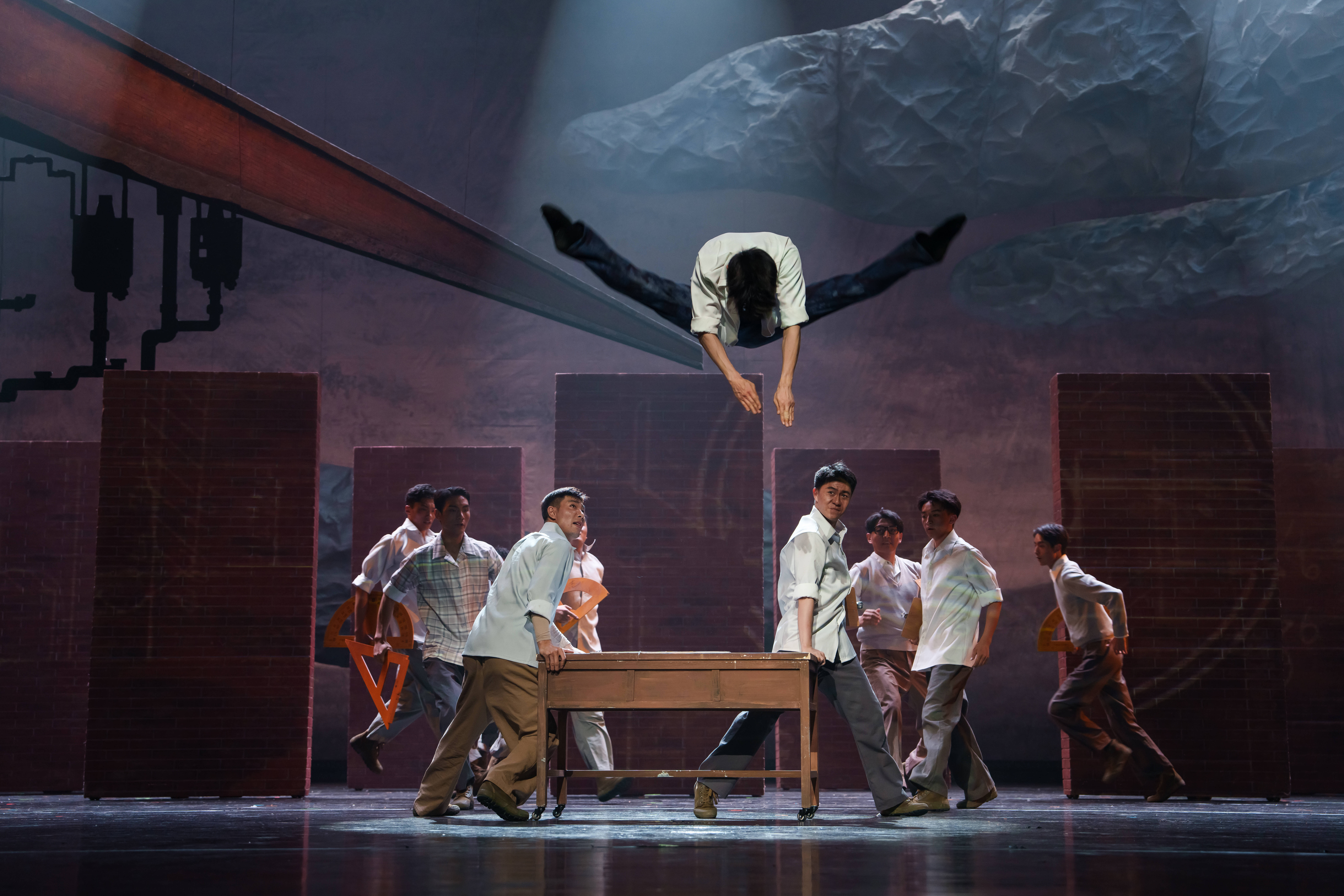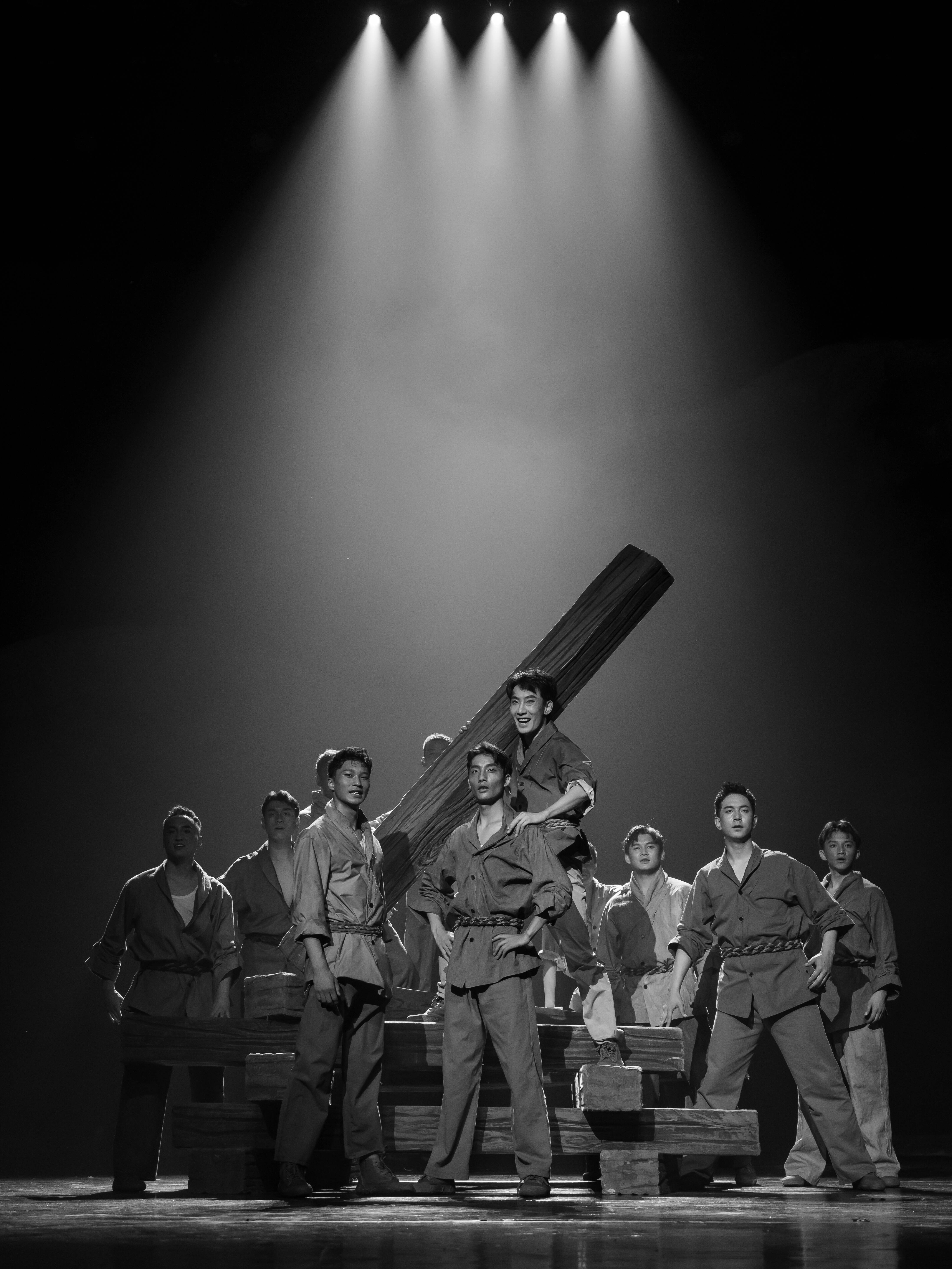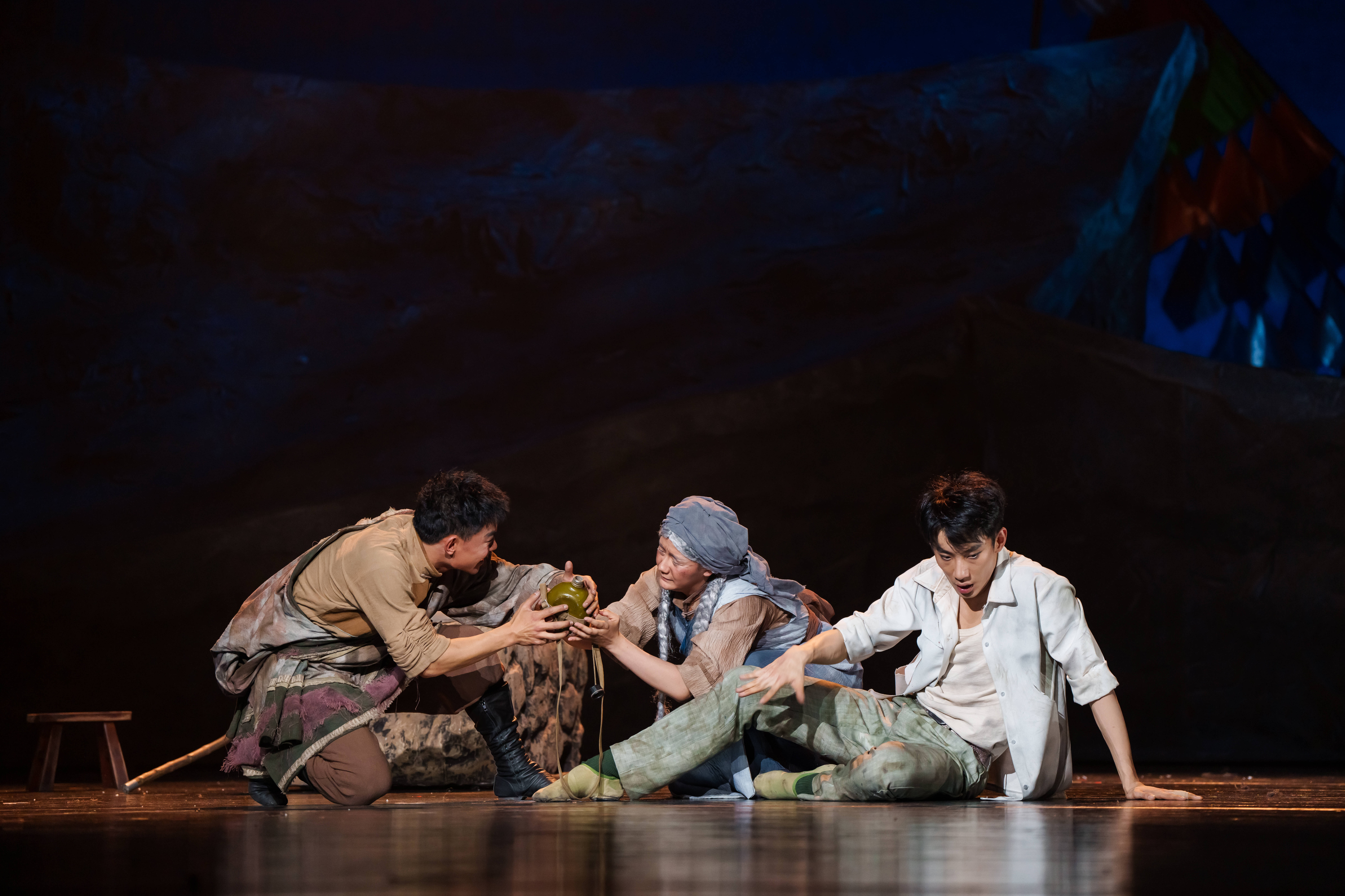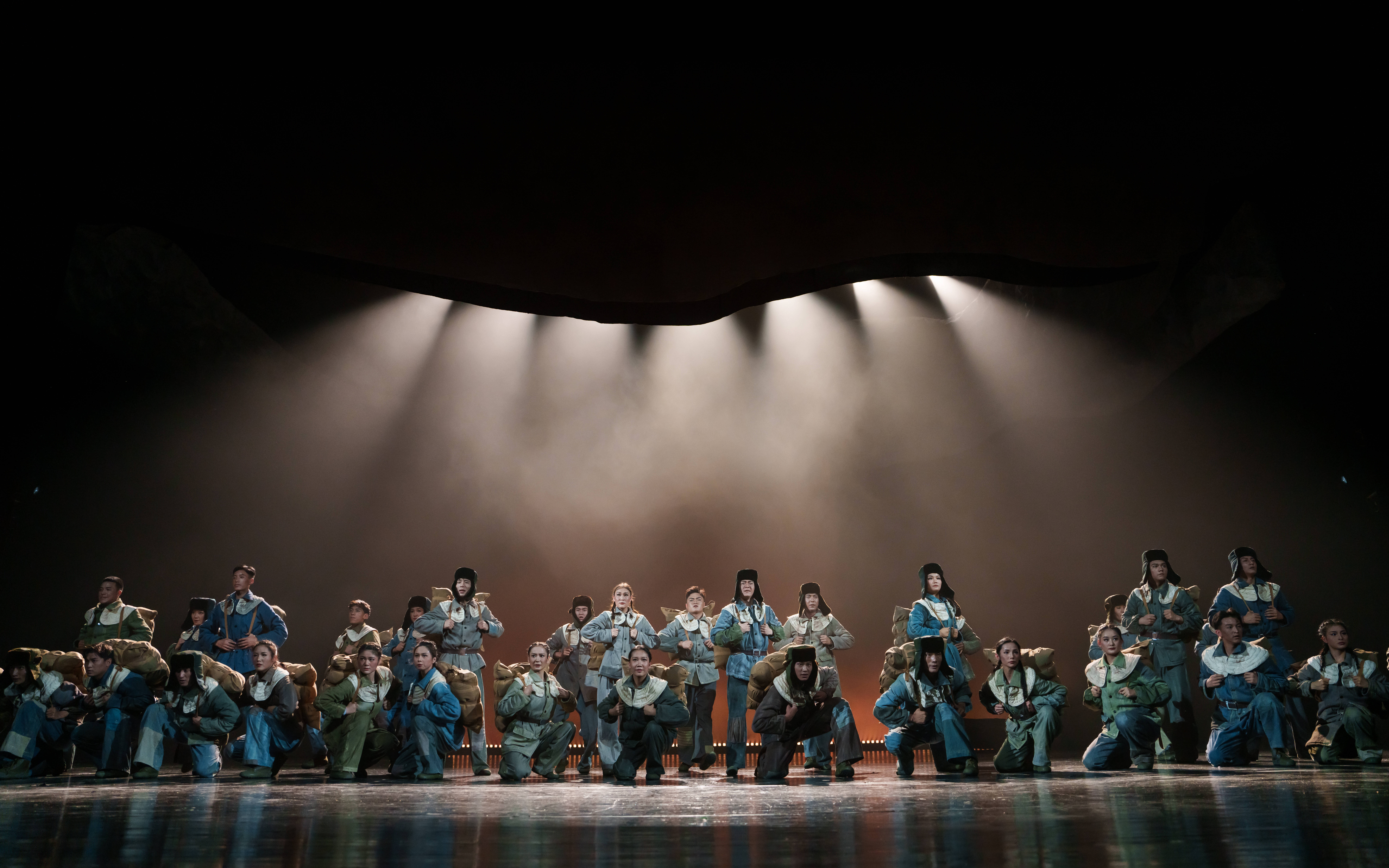 音乐创作上,该剧更是巧夺天工:悠扬婉转的草原民歌与富有时代印记的激昂旋律交相辉映,民族乐器的独特韵味与现代配乐的恢宏气势完美融合,将草原儿女的柔情与热血、科研工作者的坚韧与坚守渲染得淋漓尽致,为剧情推进注入了强劲的情感张力。舞台设计则采用纪实文学风格与纪录片艺术形式相结合的手法,活动围墙的灵活运用、虚实交织的场景转换,搭配细腻灵动的灯光舞美,既生动再现了金银滩草原“天苍苍,野茫茫”的辽阔壮美,又真实还原了科研基地从荒芜到崛起的建设图景。其中“电影院寻人”一幕尤为戳心:罗丁与索朗在熙攘人群中遥遥相望,却被流动的人潮与阻隔的围墙生生分离,简单的舞蹈动作背后,是特殊年代里普通人的遗憾与坚守,是个人命运与国家命运的深刻交织,让现场观众无不动容。