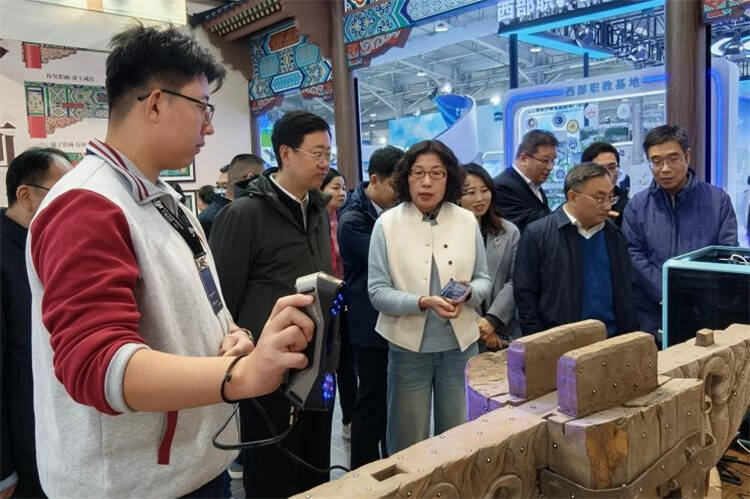 11月8日,住房城乡建设部党组书记、部长倪虹一行莅临展区视察指导。在师生共同制作的山东高青青城文昌阁古建筑模型前,倪虹部长详细听取了模型从实地测绘到手工制作的过程,对学校师生参与古建筑修复以及对现存古建筑破损部分修旧如旧的技术和能力进行了询问和了解。在古建筑构件数字活化传承与创新展台前,倪虹细致观看了师生利用三维扫描、数字建模和3D打印技术复原古建构件的过程,对山东城市建设职业学院利用现代科技手段推动中华传统建筑技艺传承与创新所取得的工作成效,给予充分肯定。