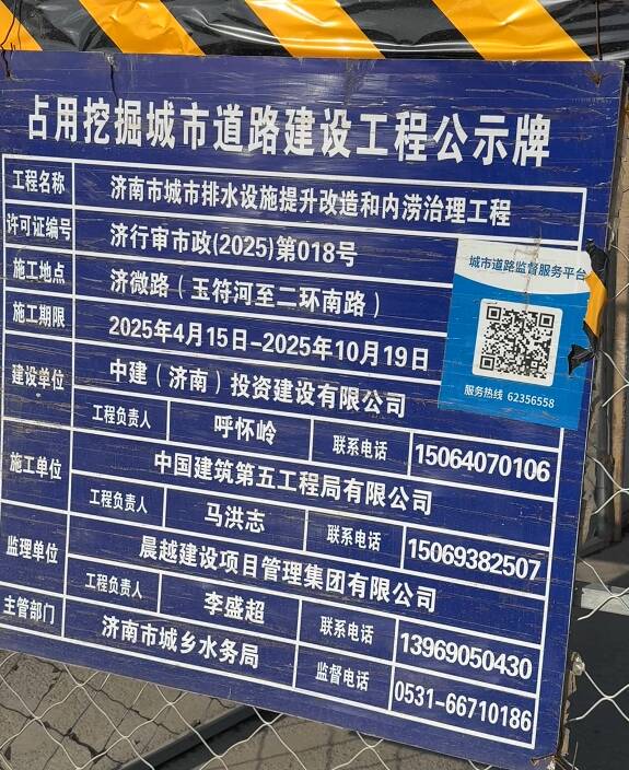 随后,记者又联系了济微路和南辛庄西路公示牌上的主管部门济南市城乡水务局,工作人员告诉记者,这两条道路均在实施雨污分流项目,而济微路部分路段原属104国道范围,施工难度相对较大。“济微路它这个原来104国道,不属于市政范围之内,所以说还挺复杂。像那种国道都没有市政管线,但是这有积水,然后就纳到了全市的雨污分流项目。”
