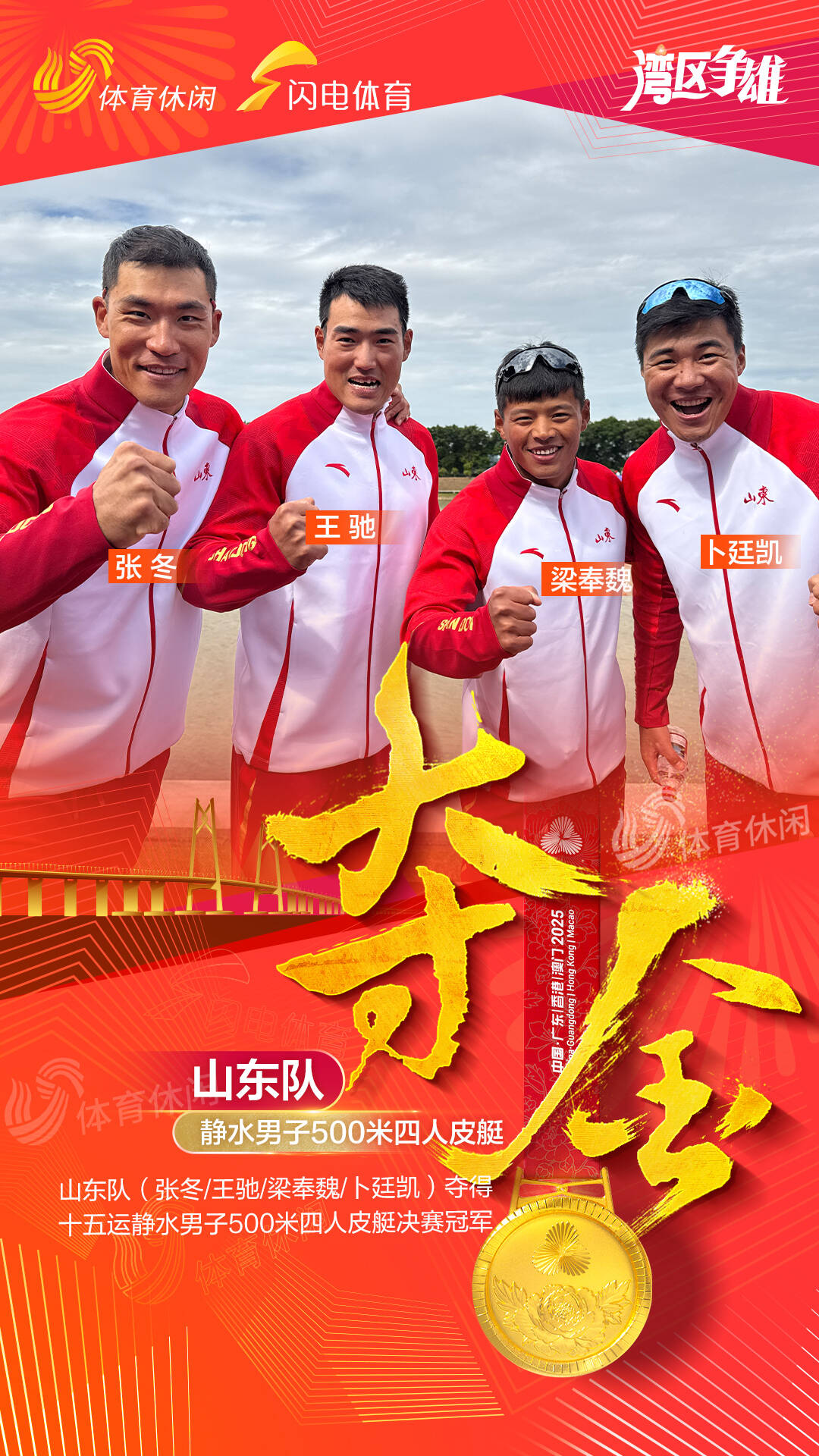 收官日首场焦点战——男子500米四人皮艇决赛中,山东队卜廷凯、梁奉魏、王驰、张冬联手出战。比赛中,福建队一度带来冲击,但山东健儿顶住压力,最终以1分20秒568的成绩率先冲线,领先福建队0.791秒,强势夺金。