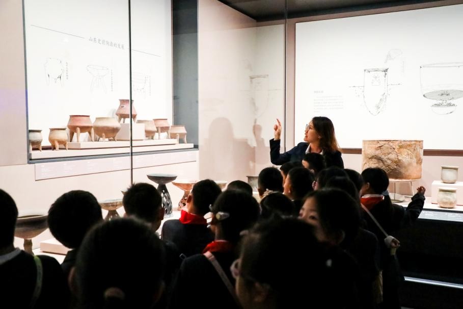 “泉城印记侦探”仔细研究不同时期的汲水器具,分析其结构特点,为设计“济南小名片”搜集素材。“陶器发明家”专注观察大汶口文化的红陶、白陶与黑陶,认真记录下陶器颜色与烧制温度的关联。“青铜裁判官”围着亚丑钺、颂簋等国之重器,对照“寻宝图”分析纹饰、猜测用途,并将神秘的青铜纹样仔细临摹下来。