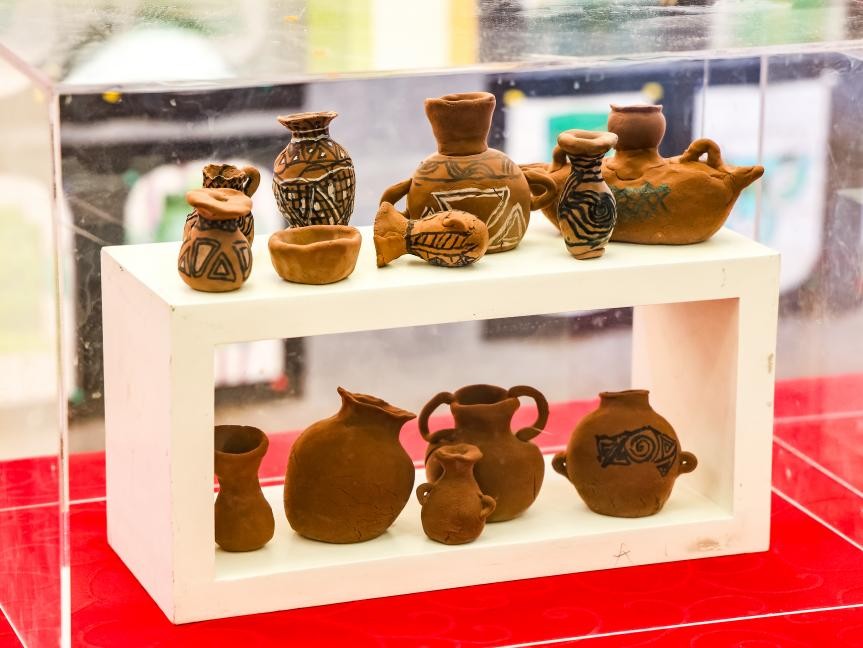 研学之旅的终点,是一场“国宝创意嘉年华”。展示大厅内,同学们亲手制作的软陶器物、陶土冰箱贴、3D打印复刻的“亚丑钺”等作品整齐陈列,琳琅满目,宛如一个充满童趣与创意的“小小博物馆”。