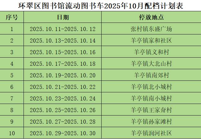 本次流动图书车在羊亭镇各社区(村庄)的具体停放时间及详细地点,敬请关注环翠区图书馆的官方信息平台。
