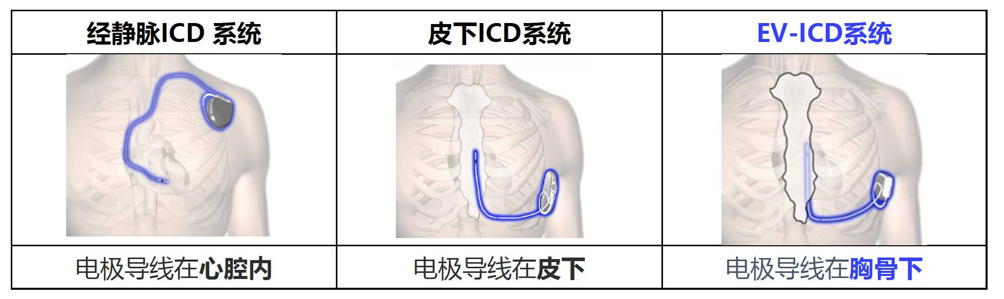 EV-ICD血管外植入式心律转复除颤器作为全球创新的植入式除颤技术,区别于现有的经静脉ICD和皮下ICD系统,采用创新的采用胸骨下除颤电极放置,避免了血管内并发症以及从心脏和血管中拔除电极导线相关的风险。