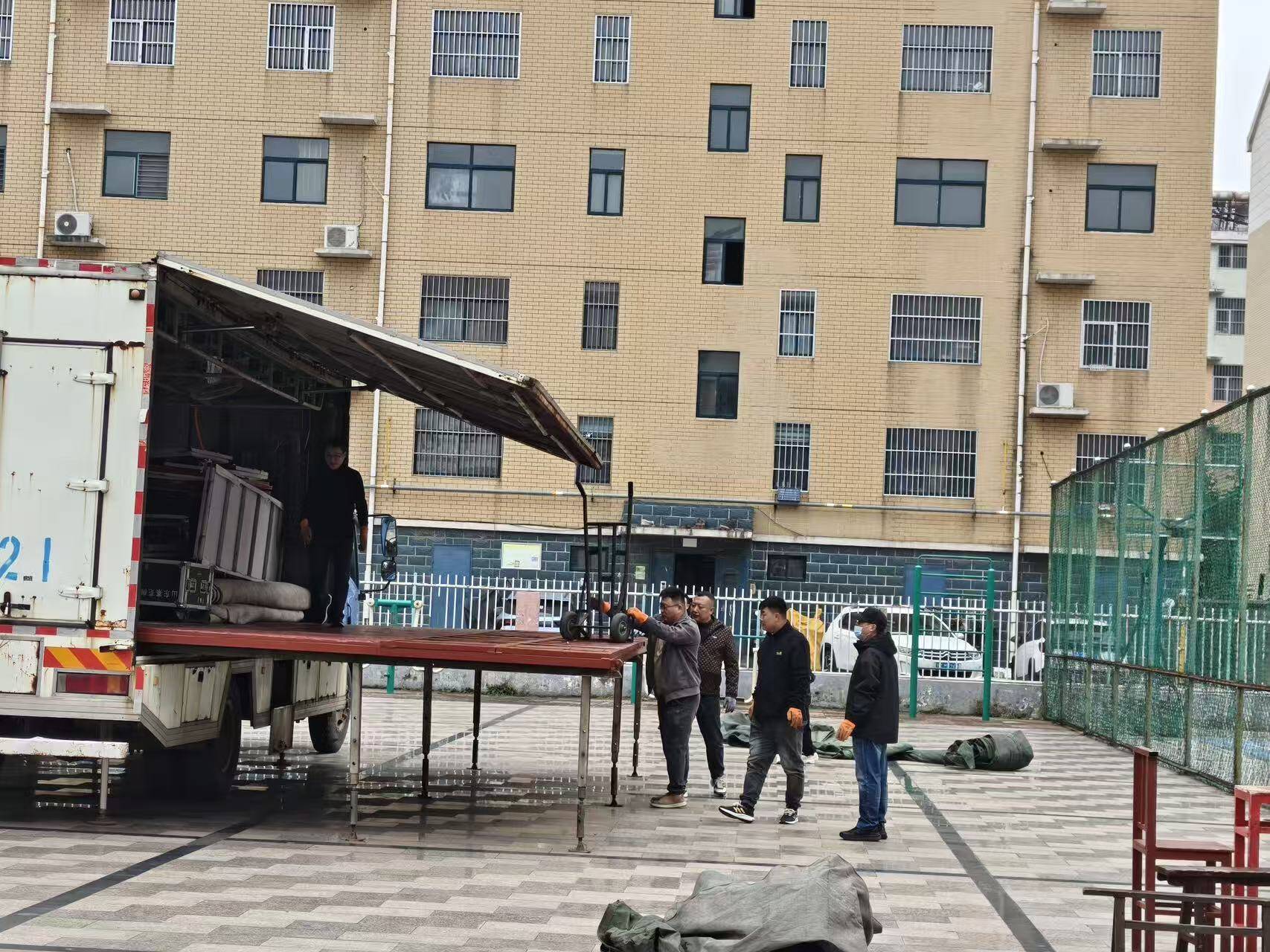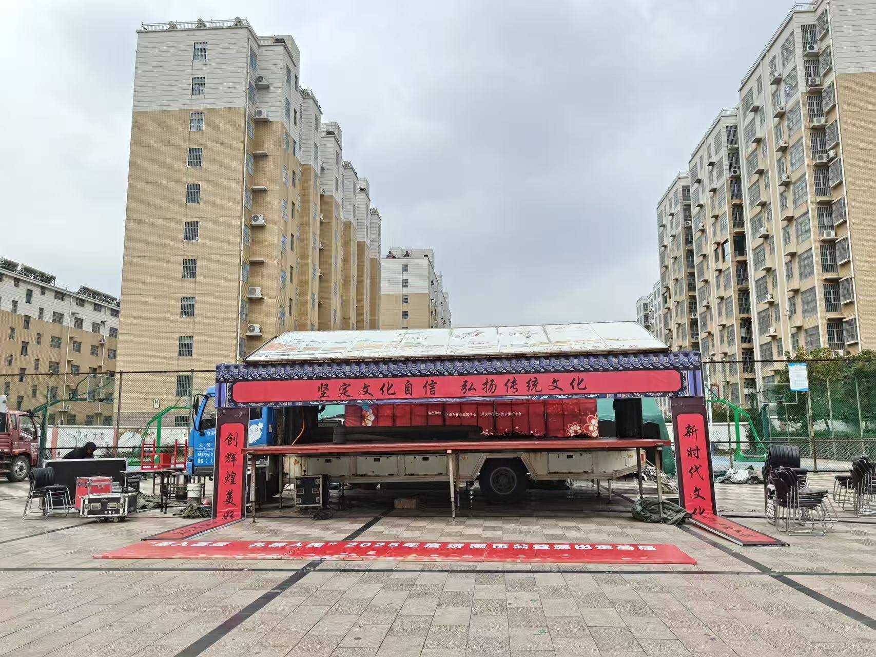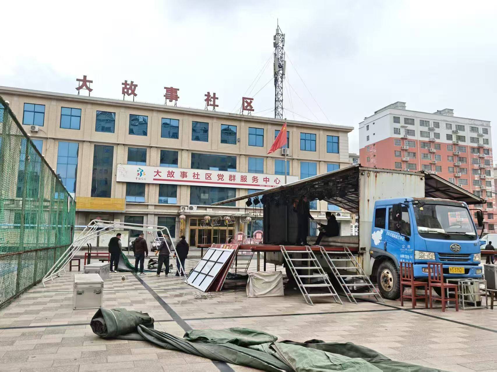 走进社区广场,便能看见一派忙碌景象:钢管支架有序拼接,红色幕布缓缓舒展,灯光设备逐一调试,工作人员们分工协作,搬卸物料、固定构件、校准位置,每一个动作都细致入微。搭建起的不仅是一方戏台,更是连接传统艺术与邻里生活的桥梁,让大家隔着不远的距离,就能感受到那份即将开演的热闹与期待。