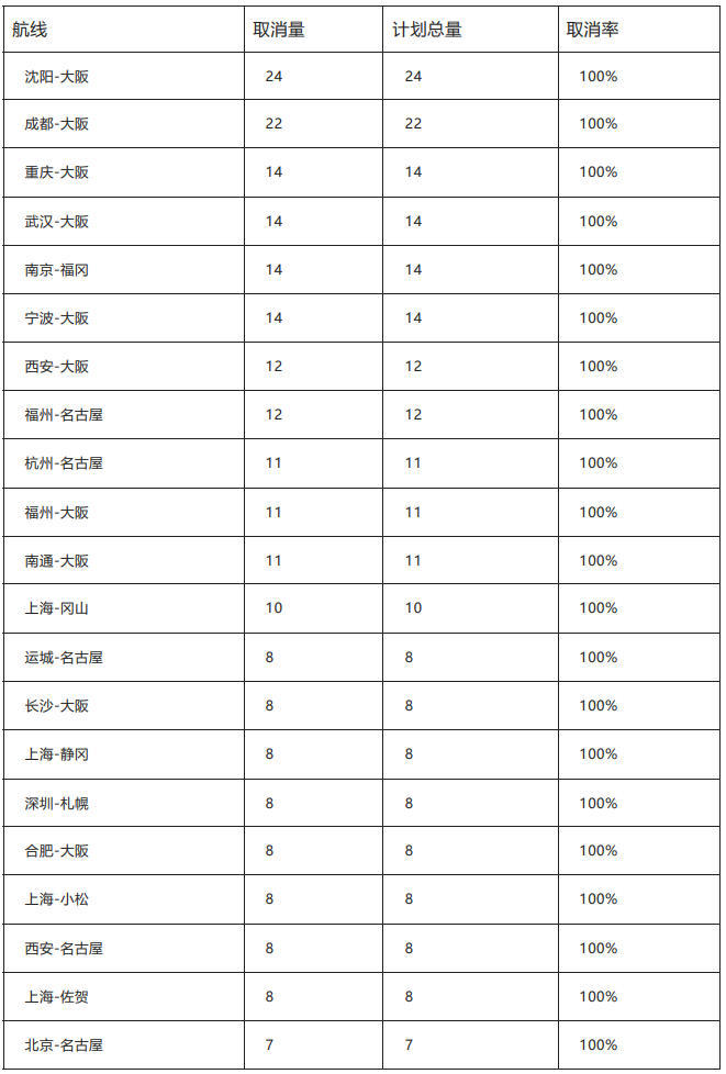 航班管家数据显示,2026年1月中国大陆赴日航班取消量已超两千班,46条中日航线未来两周“零航班”。航班管家最新统计显示,2026年1月中国大陆往返日本航班取消量已达2195班次,整体取消率40.4%;其中46条中日航线在未来两周(2025年12月23日—2026年1月5日)内计划航班全部取消,取消率100%,涉及中日双方共38座机场。