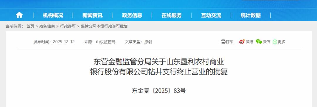 据悉,东营金融监管分局此前收到山东垦利农村商业银行股份有限公司报送的《关于核准垦利农村商业银行钻井支行终止营业的请示》(垦农商行发〔2025〕。批复明确要求,该支行终止营业后,山东垦利农村商业银行股份有限公司需妥善处理善后事宜,确保各项业务平稳移交,同时做好客户宣传解释工作,维护正常金融秩序。此外,该支行自收到批复文件后,需立即停止一切经营活动,并于15个工作日内向东营金融监管分局缴回许可证,按相关法律法规办理后续手续。