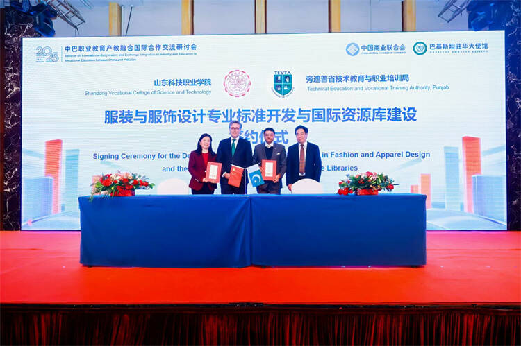 山东科技职业学院党委委员、副校长徐晓雁与旁遮普省职教局签署了服装与服饰设计专业标准开发与国际资源库建设合作协议。双方将在数字化教学资源开发、共享平台搭建、标准共建互认等方面开展深度合作。巴基斯坦驻华大使馆在会上明确了三项支持方向:一是加强战略对接与机制建设,推动人才培养成果互认;二是拓展平台功能,落地示范性合作项目;三是整合优质资源,推动职业教育资源的开放共享与联合开发,使合作成果切实惠及两国产业与青年。