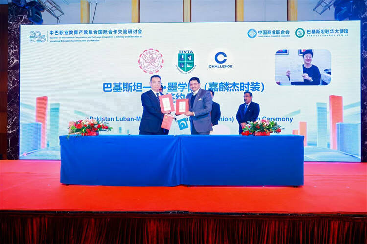 会上,山东科技职业学院党委副书记、校长刘福玉代表学校与巴基斯坦旁遮普省职教局、嘉麟杰时装共同签署了“巴基斯坦—班·墨学院(嘉麟杰时装)”共建协议,并举行了揭牌仪式。学院将紧密对接巴基斯坦纺织服装产业升级需求,依托嘉麟杰在巴基斯坦的实际生产场景,开展本土员工技能培训与学历人才培养。同时,山东科技职业学院将发挥专业群优势,通过双师共建、教材共编、评价共担等机制,提升巴方教师的技术应用与教学实施能力,推动项目可持续发展。