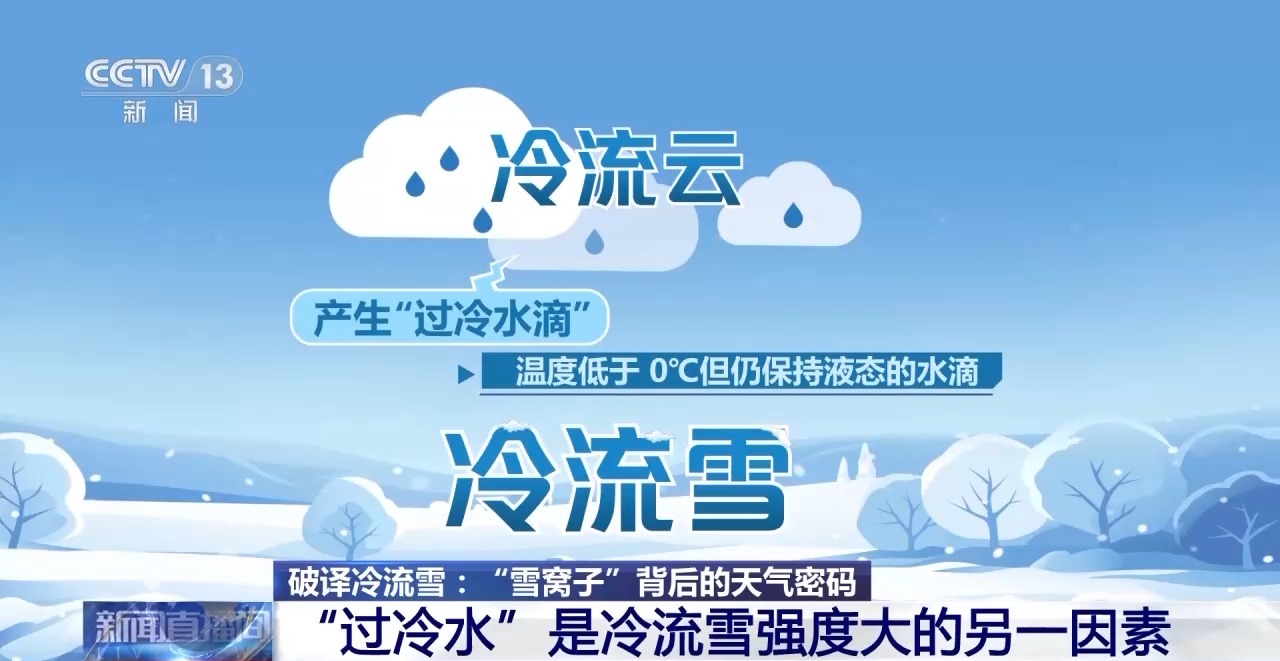 此外,“过冷水”是造成冷流雪强度大的另一关键因素。地面的冷流雪源自空中的冷流云,云中可产生“过冷水滴”,也就是温度低于 0℃但仍保持液态的水滴,这些过冷水滴不仅能促进小冰晶形成,一旦碰到微小的冰晶,还会迅速冻结附着上去,助力冰晶生长。通常,强冷空气影响时,冷流云中的温度多在-10~-20℃之间,适合冰晶生长为具有六角枝状结构的雪花,复杂的枝杈结构相互交错、嵌合,落地后就形成蓬松的雪团。而当云内过冷水含量非常丰富时,会直接在雪花表面冻结为含冰量很高的霰粒子,而霰的出现常被视为暴风雪的前兆之一。