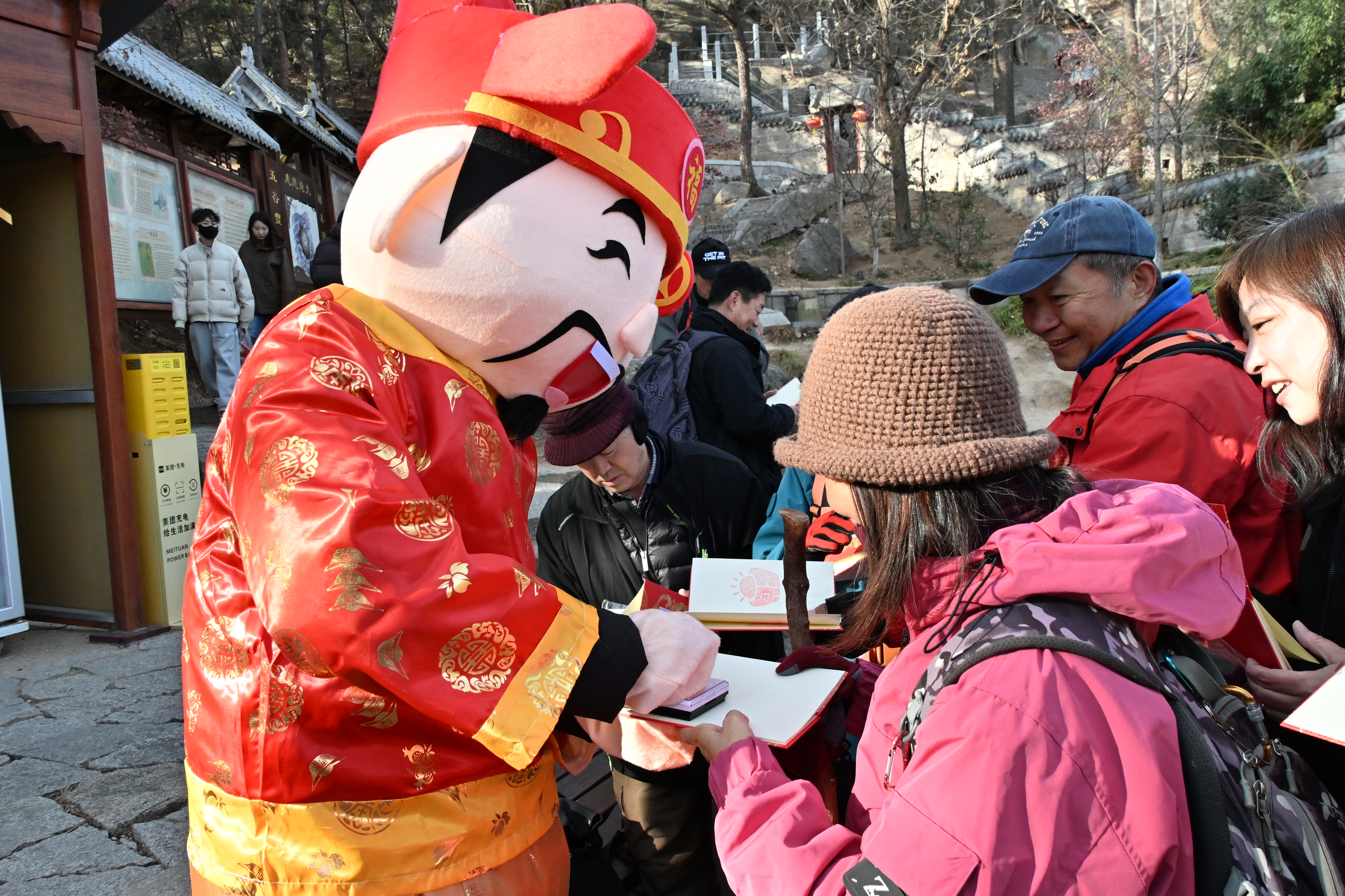 记者了解到,活动现场的“福禄寿财·欢聚崂山”沉浸式剧游成为一大热点。游客领取“祈福文牒”后,化身“寻寿集福”的崂山有缘人,在登山途中与“财神”“福仙”“寿老”“禄星”四路吉祥意象NPC互动,打卡华盖迎宾、太平广场、寿字峰、索道上站四大点位,完成吉祥语对答、福字闯关、挂祈愿卡、猜灯谜等趣味任务,集齐“福禄寿财”四枚印记,最终兑换寓意吉祥的王哥庄特色面鱼,沉浸式的互动体验让登山祈福之旅充满乐趣。