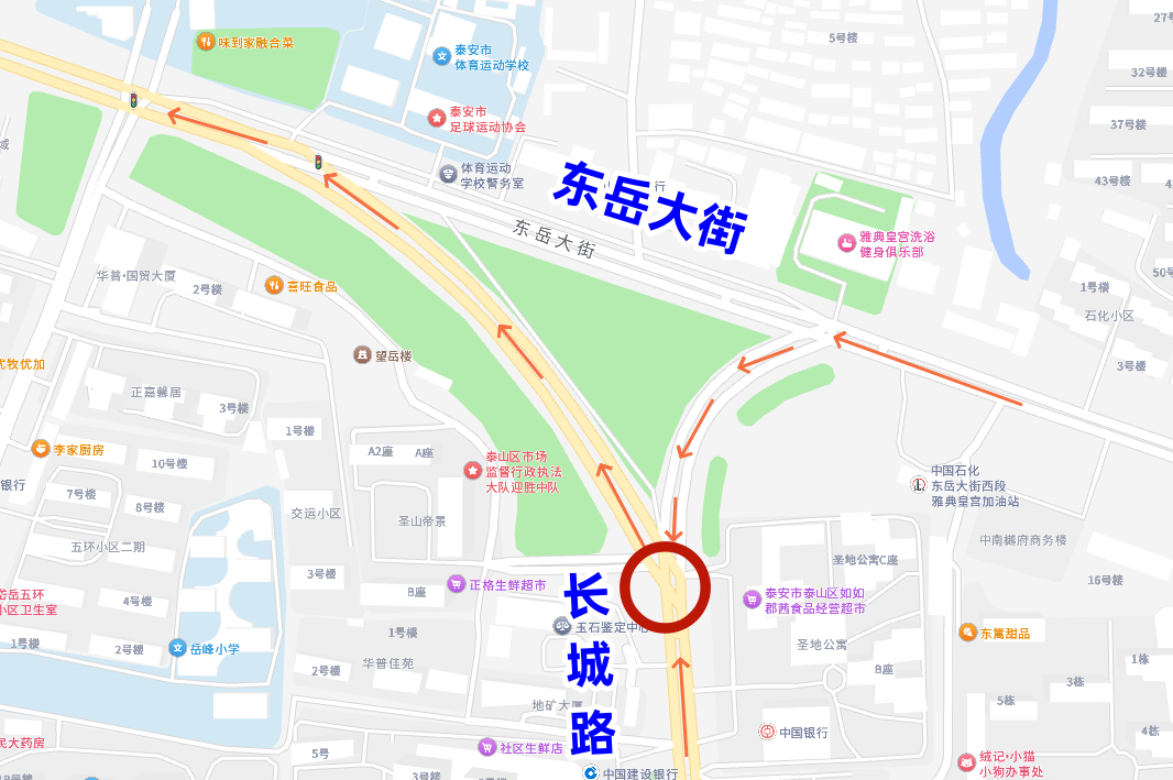 为什么要进行这次改造?主要源于该路口长期存在的几大通行难题:一是长城路与东岳大街路口为异形交叉口,东岳大街由东向南左转与长城路由南向西左转的车流存在冲突;二是长城北路无法与长城路直接连通,制约区域交通循环效率;三是东岳大街西向东非机动车及行人的绕行距离远;四是东岳大街与长城路路口存在两个信号灯,控制通行效率低。