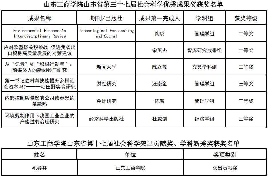 齐鲁网·闪电新闻1月7日讯 近日,山东省人民政府发布了《关于表彰山东省第三十七届社会科学优秀成果奖获奖成果和第十七届社会科学突出贡献奖、学科新秀奖获奖人员的通报》,山东工商学院共荣获7项奖励,其中成果奖6项,突出贡献奖1项。