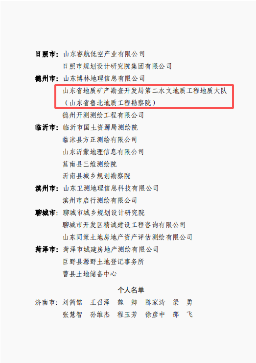 近日,山东省测绘地理信息行业协会公布年度评选结果,山东省地矿局第二水文队凭借在测绘地理信息领域的优异表现,连续两年荣获“工作成绩突出单位”称号。