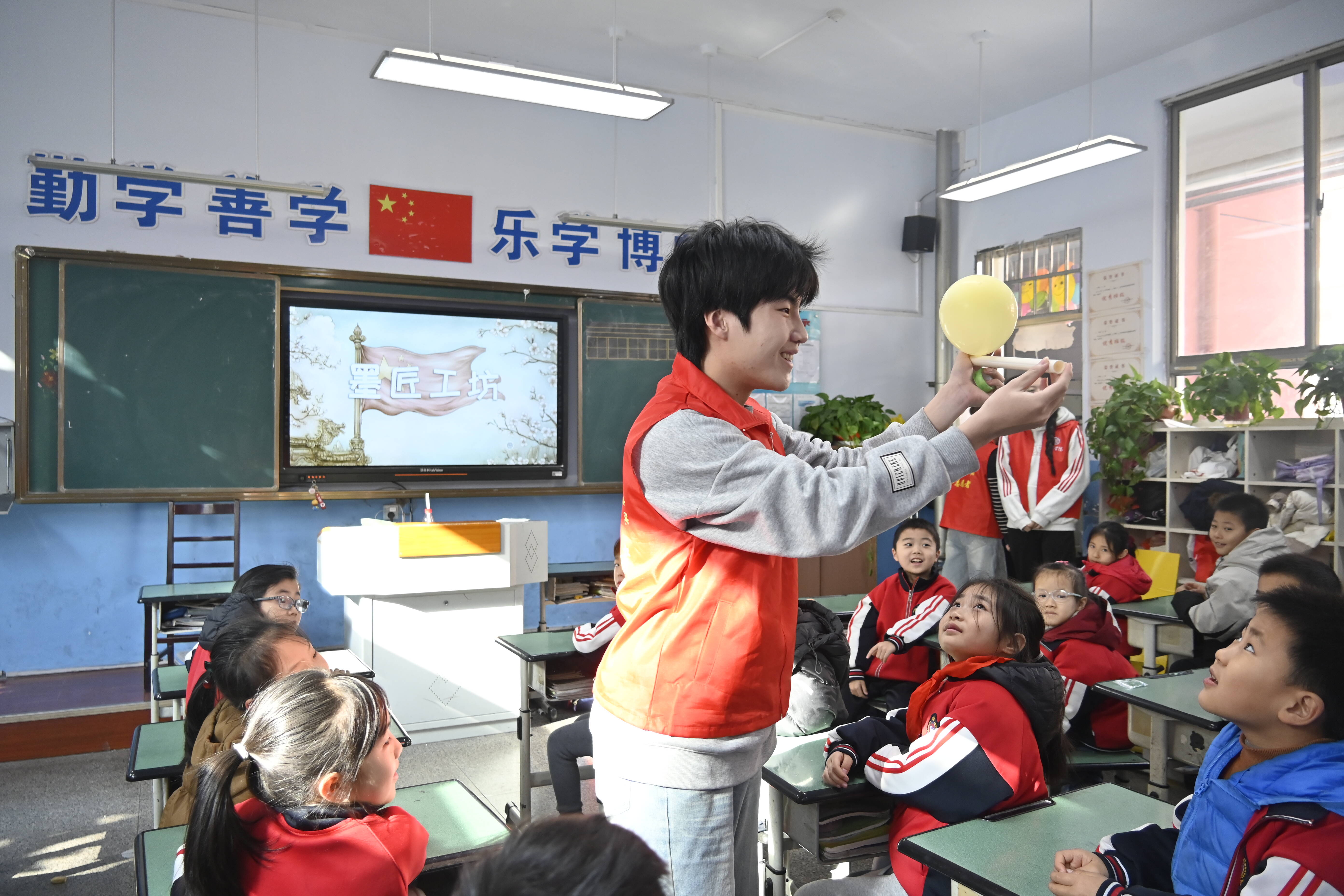 在“祖国旗帜在我心”课堂上,枣庄学院的志愿者们讲述了党旗、国旗、军旗、团旗、队旗的历史故事与象征意义,用生动案例,让孩子们感受旗帜背后的信仰力量,激发爱国情怀。志愿者们还介绍了墨子在光学、力学、声学等领域的超前成就,还现场演示了空气号角振动发声实验、汽笛手工制作,让孩子们在动手实践中感受古代科技的魅力,传承千年匠心智慧。