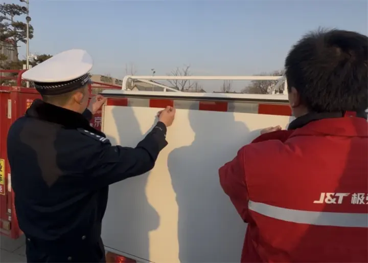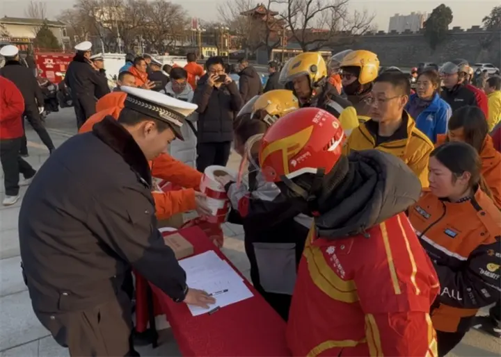 1月13日,市公安局交通管理支队联合市市场监管局、市邮政管理局、中国平安财产保险股份有限公司泰安中心支公司共同启动“冬季守护、平安出行,关爱两员、亮尾行动”主题活动,通过为配送车辆粘贴反光标识,提升骑手在黄昏、夜间及恶劣天气下的可视性,筑牢道路交通安全防线。