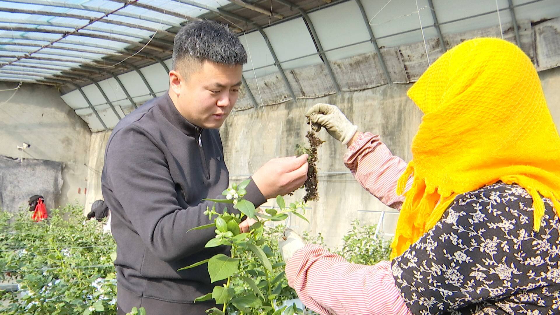 铺集镇高家庄村的蓝莓种植大棚里,负责人宋超正在和工作人员交流蓝莓授粉期的管护经验。