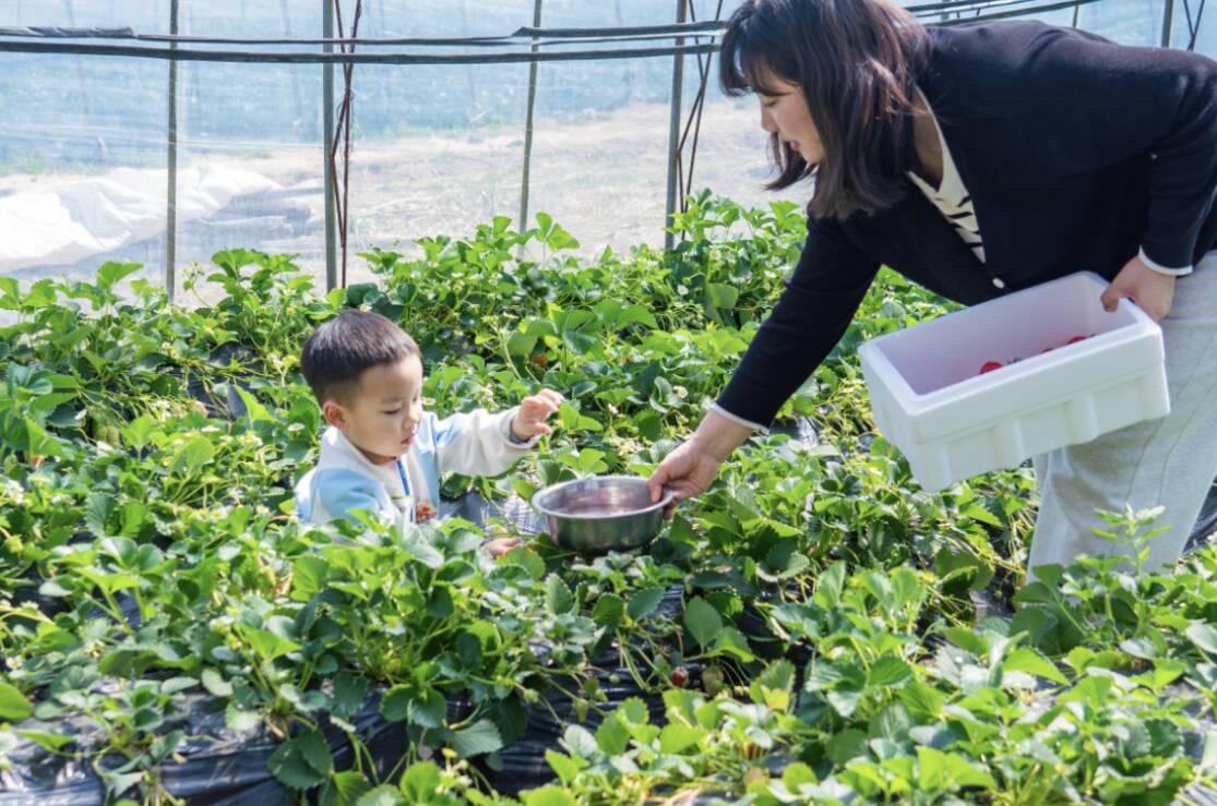 走进围山河村草莓公社的大棚,一垄垄草莓长势喜人,阵阵清甜果香扑面而来,让人垂涎欲滴。“要选这种全红、果蒂新鲜的,这样的草莓最甜。”亲子采摘大棚内,游客张斌正带着6岁的女儿挑选草莓。小家伙摘下一颗草莓迫不及待地送进嘴里:“爸爸,这个草莓好甜!”张斌告诉记者,他是从朋友圈看到大场草莓上市的消息,特意趁着周末带家人过来体验采摘。“既能让孩子亲近自然,又能吃到新鲜的草莓,还能顺便逛逛乡村、放松心情,这种休闲方式特别好。”张斌说。