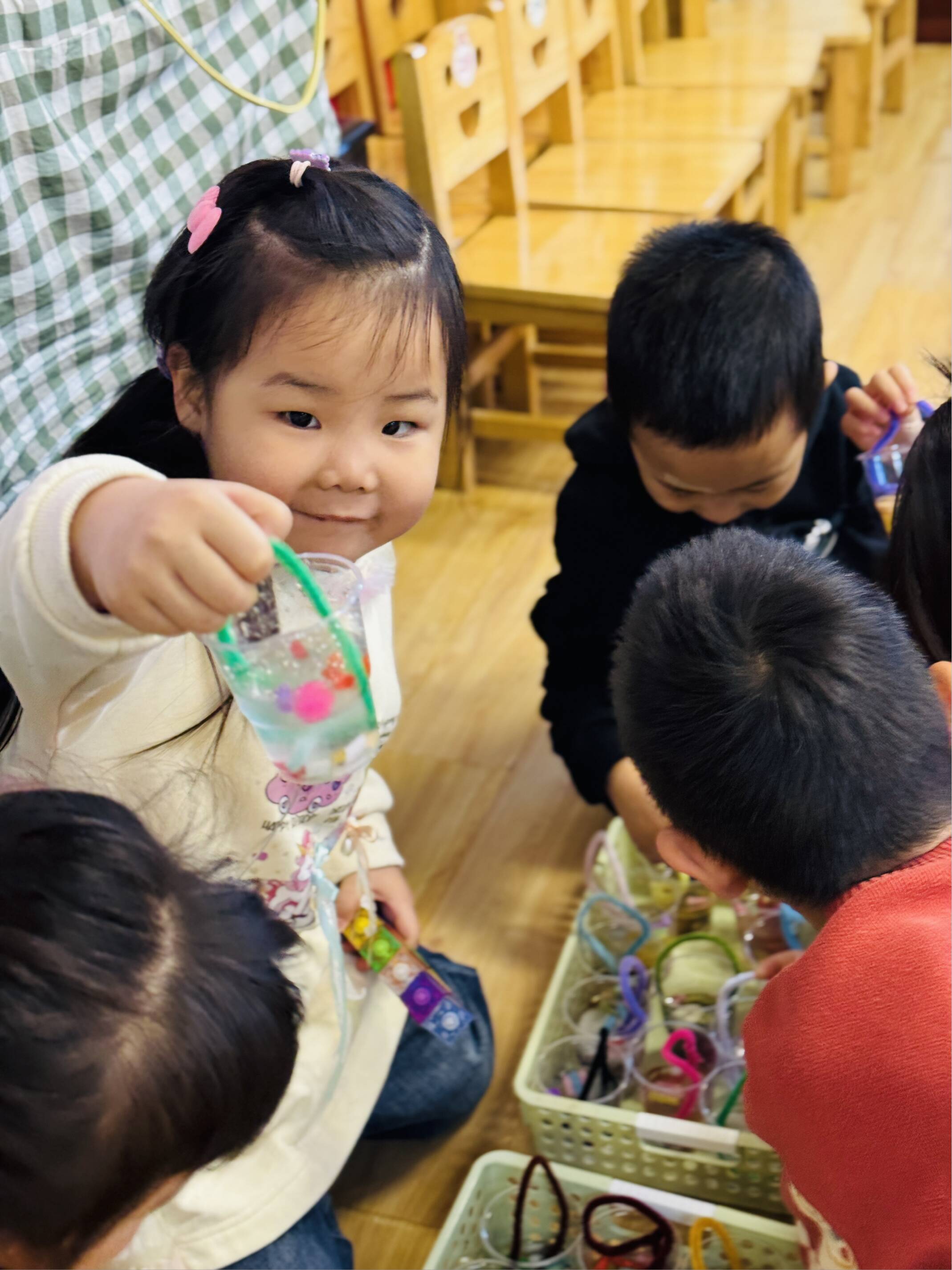活动前,教师结合幼儿的认知特点,通过趣味绘本、动画短片讲解水遇冷结冰的科学原理。制作环节中,孩子们化身小小创作家,将彩色亮片、花瓣、小树枝等材料放入模具,注入清水。在期待中,大家将模具摆放至户外,静待水的“变身”。