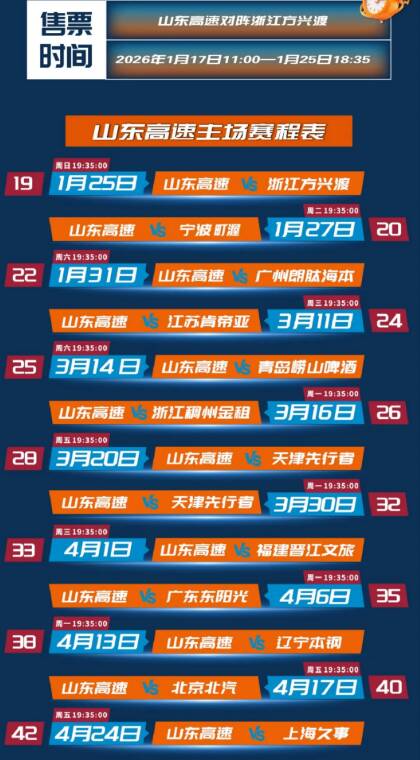 闪电体育1月17日讯 1月25日,山东高速男篮将重返山东省体育中心山东高速篮球馆,开启本赛季在济南的首个主场赛事,届时将与浙江广厦展开激烈对决。日前,官方售票通道已正式开启,并将持续开放至1月25日18:35。