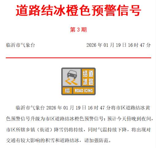 齐鲁网·闪电新闻1月19日讯 19日16时47分,临沂市气象台将市区道路结冰黄色预警信号升级为市区道路结冰橙色预警信号。