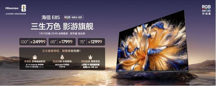 1月19日20:00,海信E8S已在海信官方商城、京东、天猫、抖音等主流平台正式开售。
