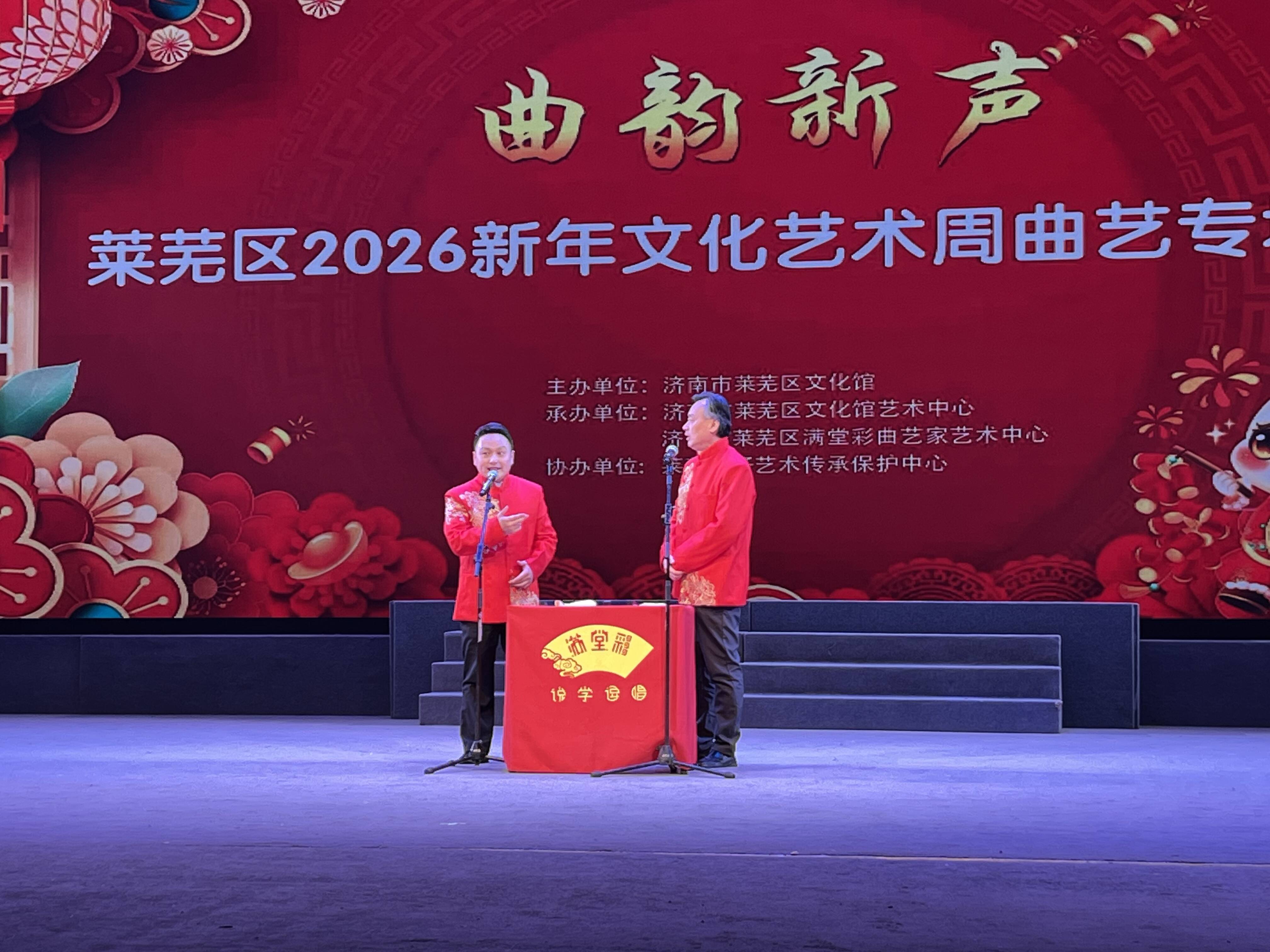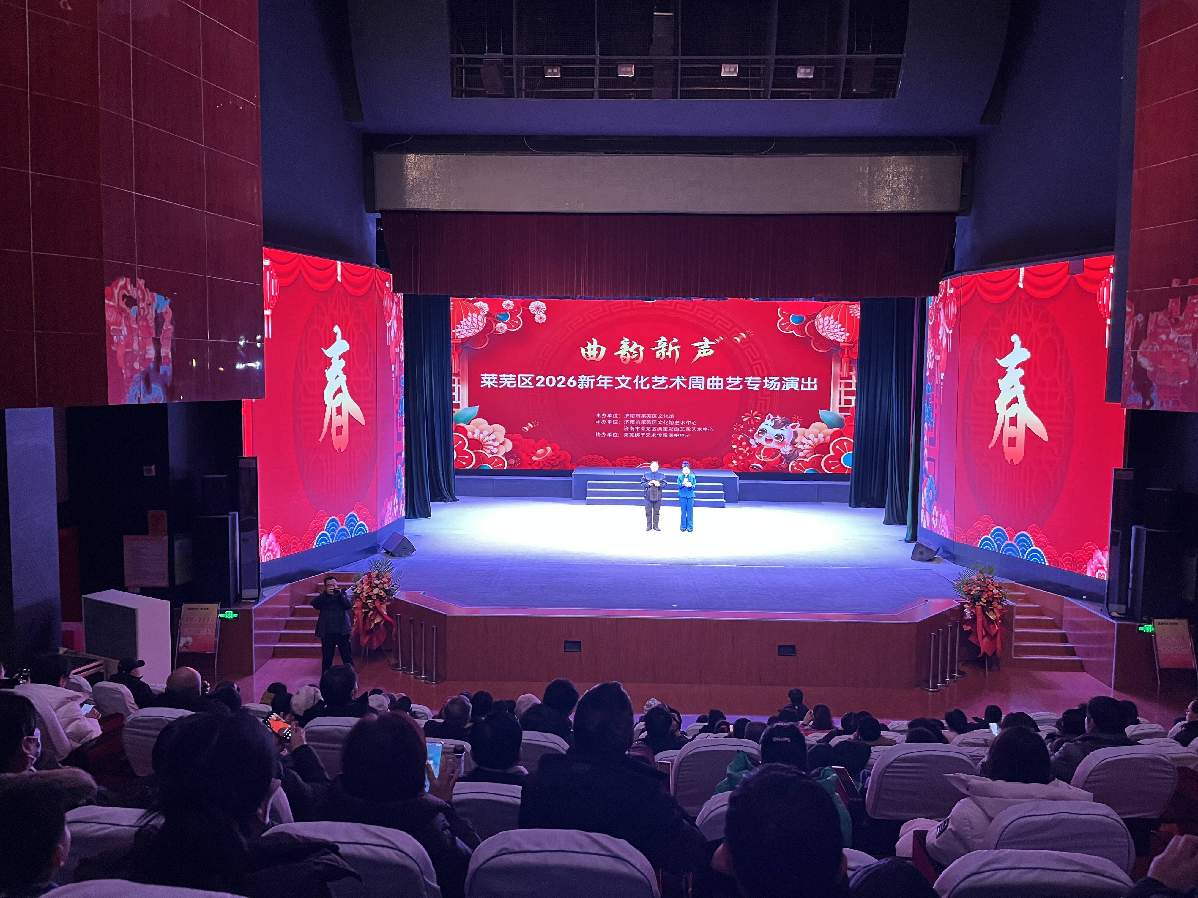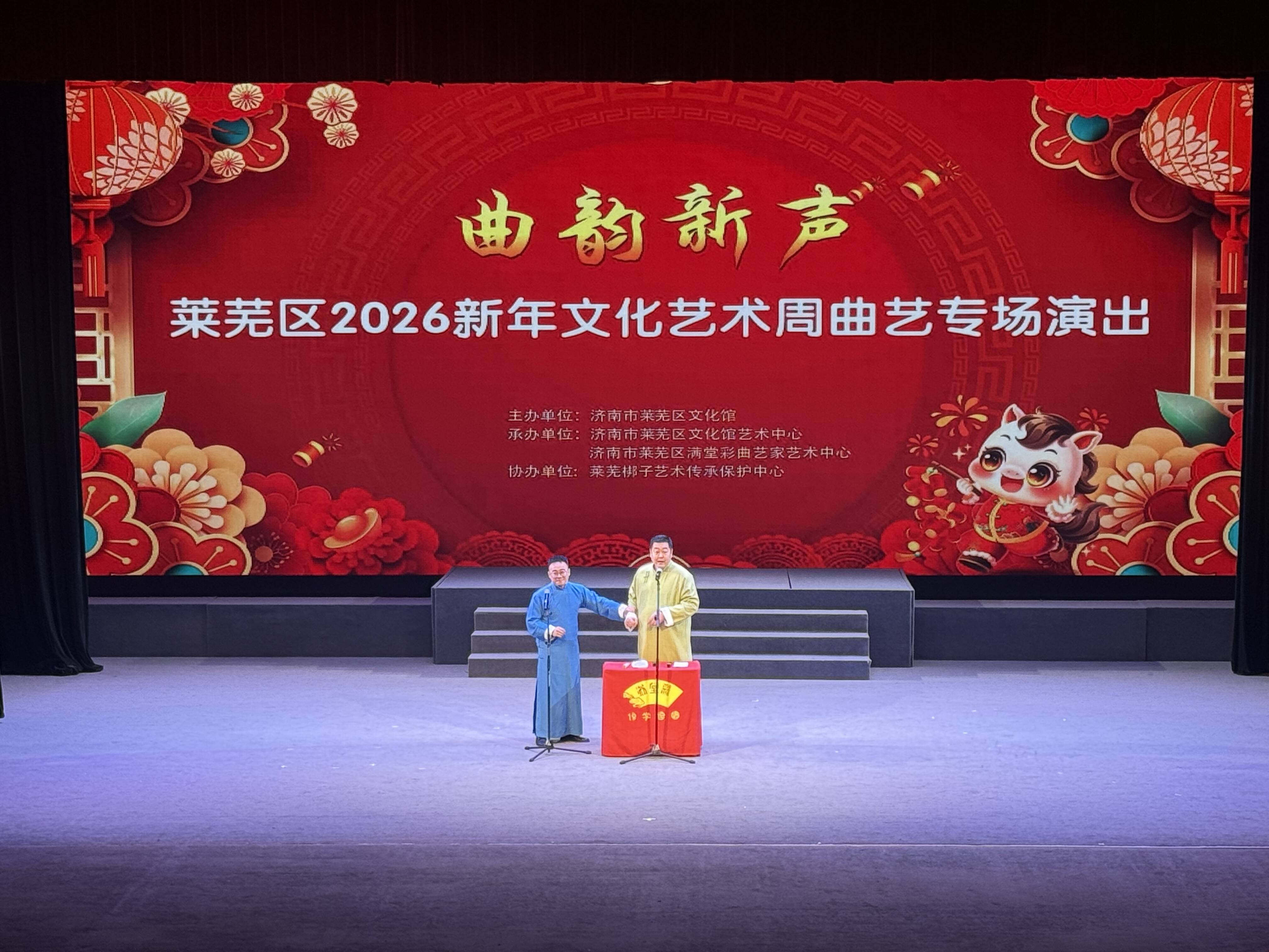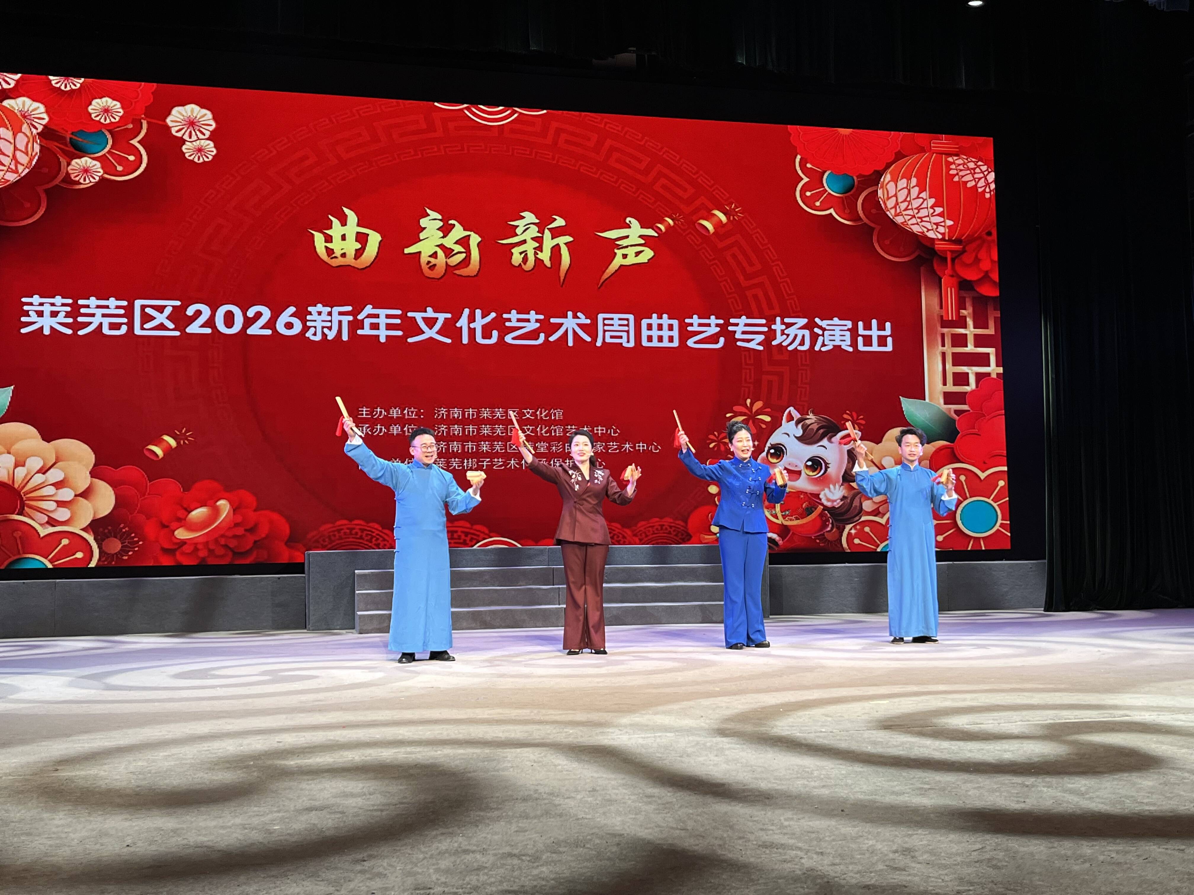 齐鲁网·闪电新闻1月20日讯 1月18日下午,“曲韵新声”济南市莱芜区2026新年文化艺术周曲艺专场演出在莱芜梆子演艺剧场举行。