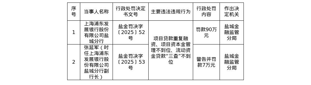 罚单显示,上海浦东发展银行股份有限公司盐城分行的主要违法违规事实(案由)为:项目贷款重复融资、项目资本金管理不到位、流动资金贷款“三查”不到位。