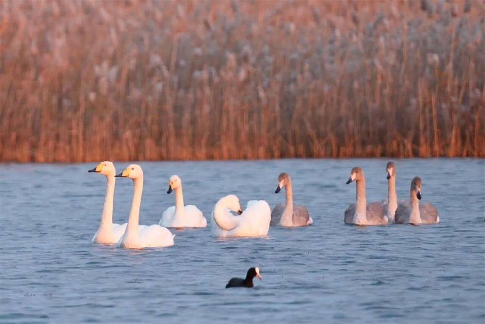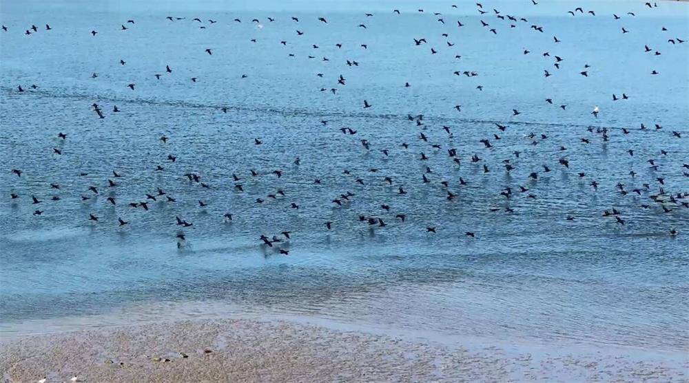 作为候鸟迁徙路线上的重要节点,当前正值候鸟过境高峰期,除鸬鹚外,威海南海天鹅休憩地也迎来了国家二级保护动物天鹅。洁白的天鹅舒展双翼、嬉戏游弋,与碧海金滩相映成趣。