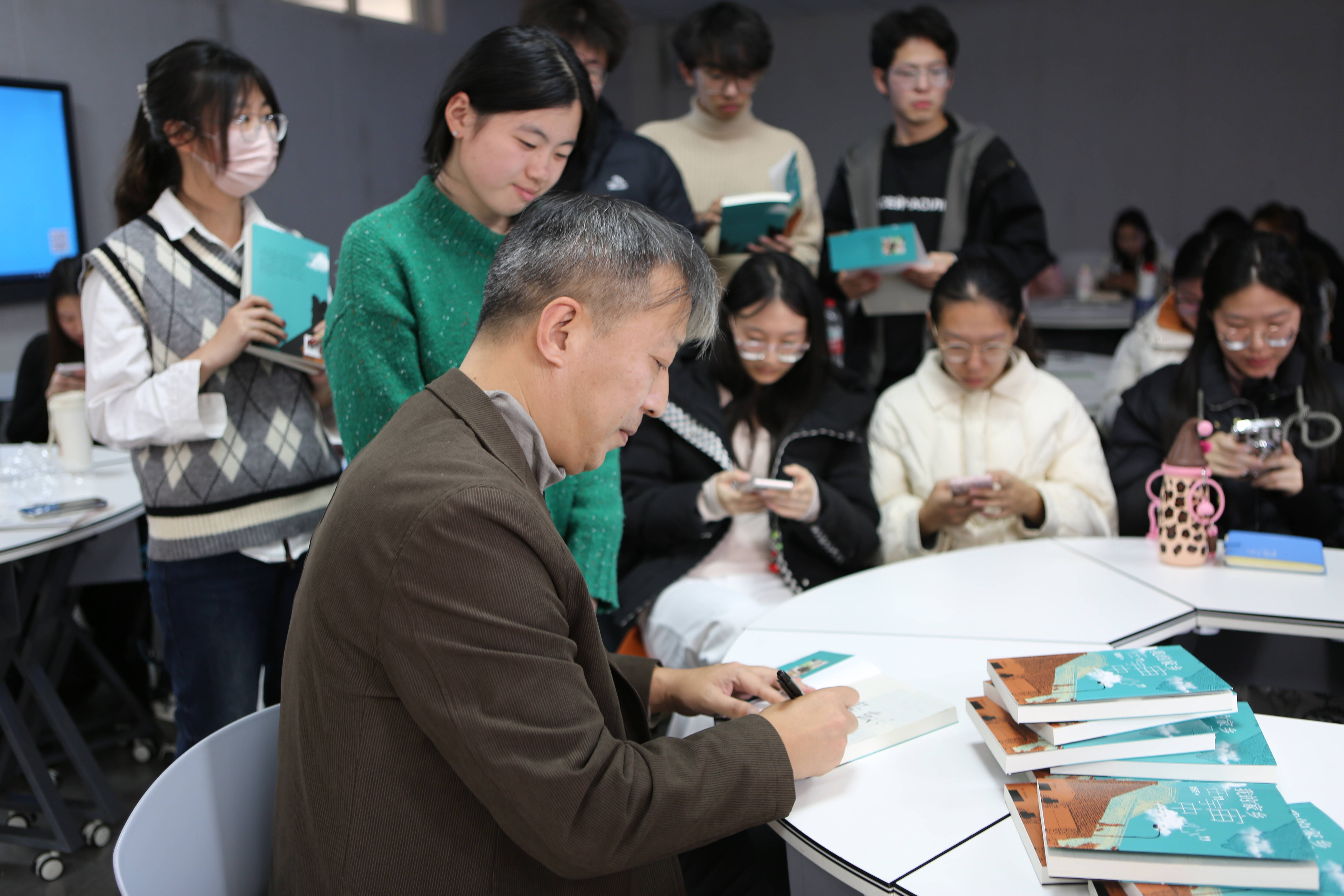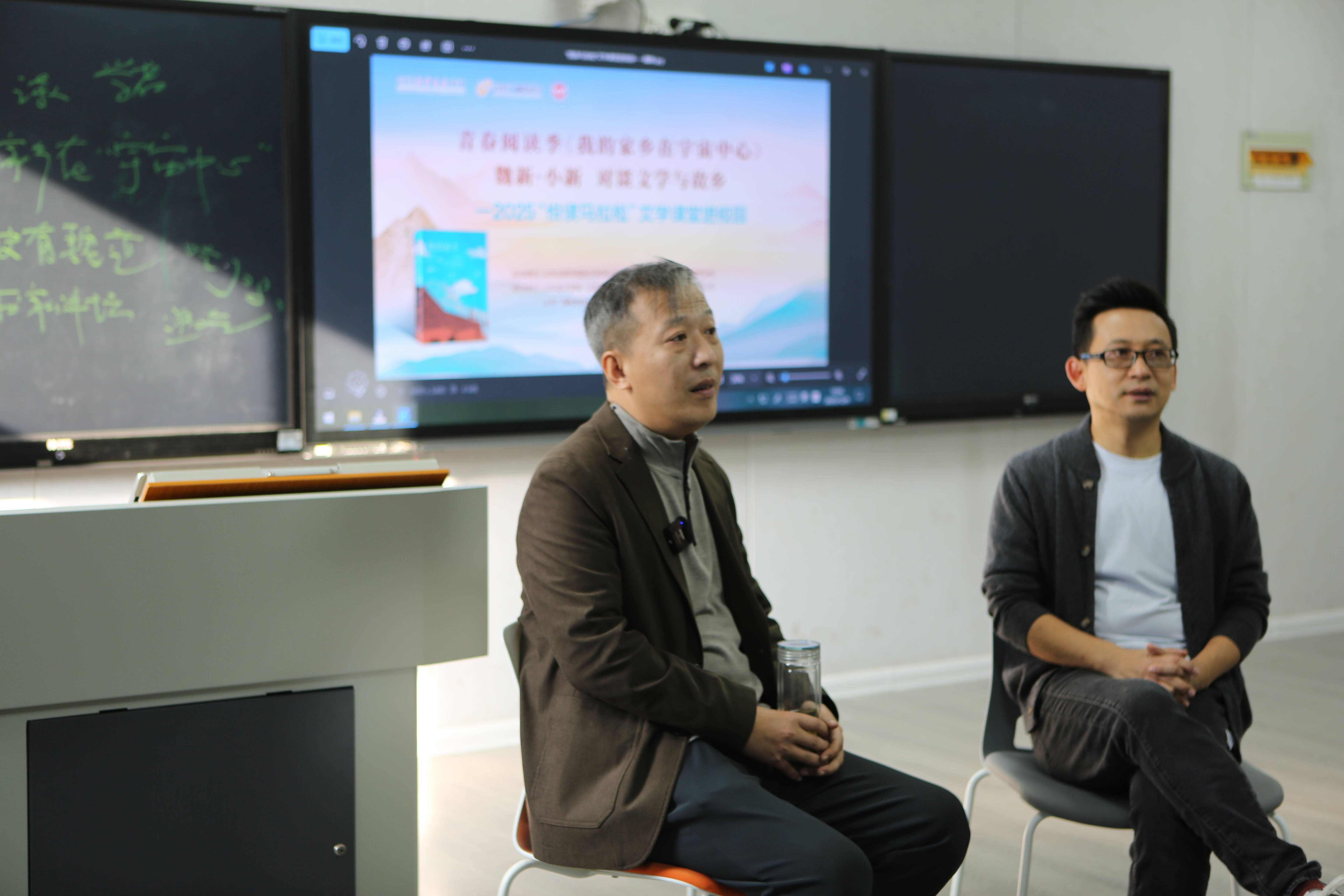 互动环节气氛热烈,同学们踊跃提问,针对学生提出的创作困惑,魏新以自身为例,鼓励大家“从模仿起步,在阅读中形成自我风格”;肖辉馨则建议同学们搭建个人阅读体系,让阅读成为滋养成长的日常习惯。现场魏新为学生们赠送了《我的家乡在“宇宙中心”》签名著作,为校园书香文化注入新的活力。