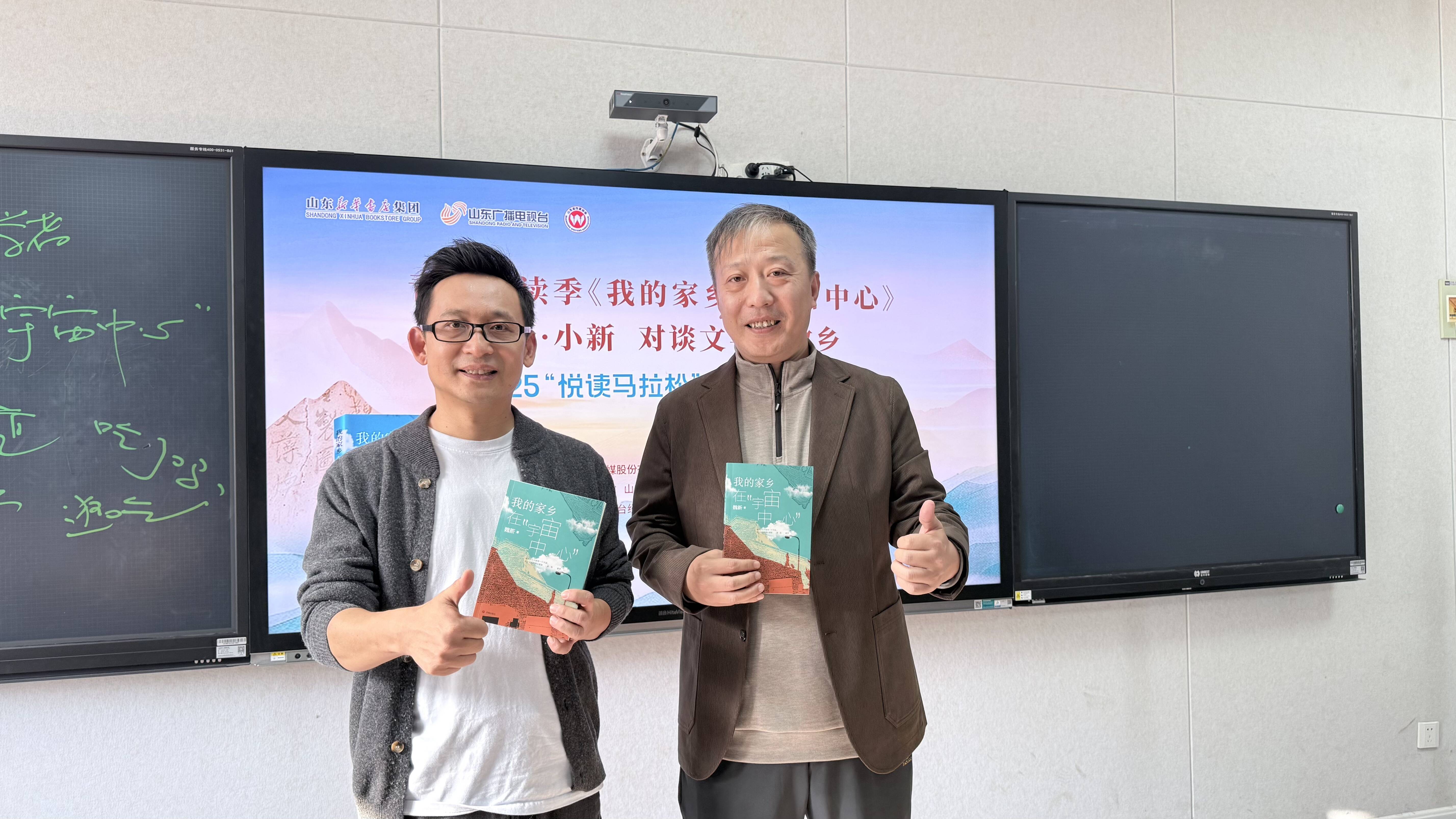 齐鲁网·闪电新闻12月9日讯 (山东经济广播记者丁瑜) 书香润芳华,文韵启新思。12月9日上午,2025“悦读马拉松”文学课堂进校园活动走进山东女子学院传媒学院,一场以青春阅读季《我的家乡在“宇宙中心”》 为主题的文学对谈精彩开讲。著名作家、央视《百家讲坛》主讲人魏新与山东女子学院传媒学院教工第一党支部书记、副教授肖辉馨(小新),携手为传媒学院学生带来了一场浸润心灵的文学盛宴。