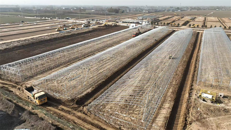“项目总占地面积26.67公顷,总投资5200万元,规划建设高标准日光温室大棚48个,同步配套建设1栋钢结构分拣包装车间。”项目负责人薛国兵介绍,目前,分拣车间主体已经完工,部分大棚主体进入组装阶段。建成后,预计番茄年亩产达1.5万公斤,可实现年销售收入2600余万元。