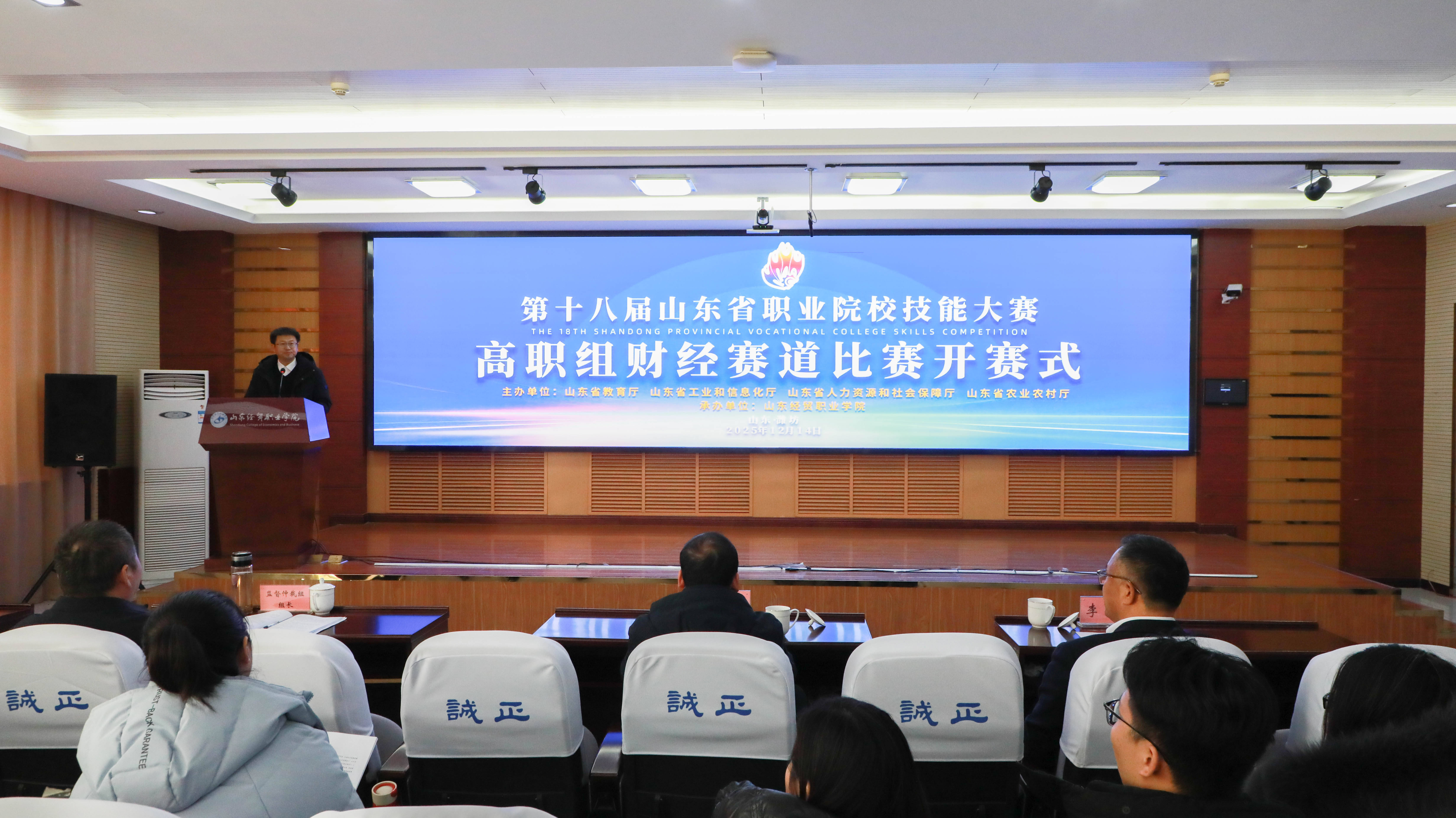 齐鲁网·闪电新闻12月15日讯 12月14日下午,第十八届山东省职业院校技能大赛高职组财经赛道比赛开赛式在山东经贸职业学院第二报告厅举行,来自全省30支代表队的118名选手将展开为期2天的同台竞技比拼。山东经贸职业学院党委副书记、院长陈卫国,潍坊市职业教育发展研究中心主任李刚,赛事裁判长、监督仲裁组组长等出席活动。开赛仪式由学院副院长张强主持。