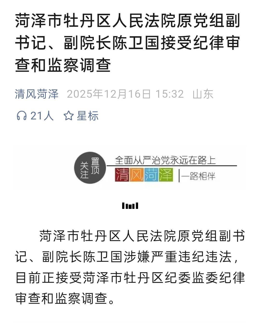 齐鲁网·闪电新闻12月16日讯 中共菏泽市纪律检查委员会官方微信公众号“清风菏泽”12月16日发布:菏泽市牡丹区人民法院原党组副书记、副院长陈卫国涉嫌严重违纪违法,目前正接受菏泽市牡丹区纪委监委纪律审查和监察调查。