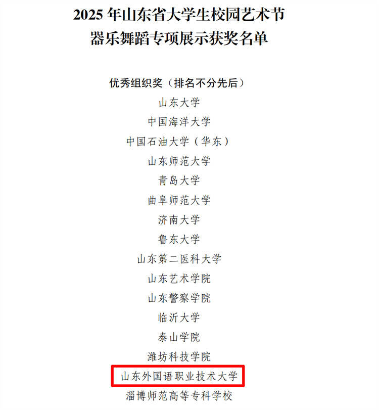 齐鲁网·闪电新闻12月17日讯 近日,省教育厅公布2025年山东省大学生校园艺术节器乐舞蹈专项展示活动获奖情况,山东外国语职业技术大学选送的4部作品全部获奖。其中,《秋日》《淡妆浓抹总相宜》获舞蹈甲组一等奖,器乐作品《天山之歌》获甲组二等奖,《唱支山歌给党听》获甲组三等奖,学校荣获“优秀组织奖”。