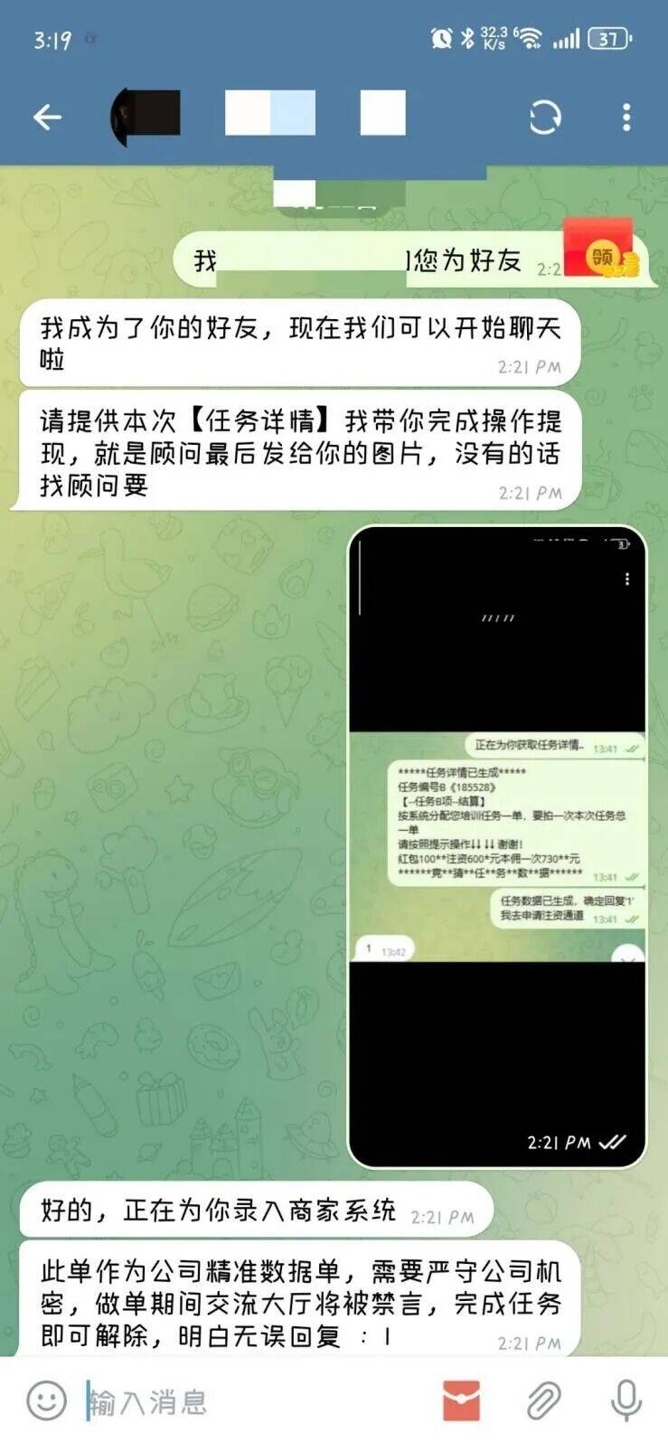 打开软件后,刘女士加入了一个名为“福彩如意3D彩民交流群”的群组,群内充斥着大量刷单返利的信息,这让刘女士十分心动。不久后,群内一名自称“资金专员”的顾问联系刘女士,称可以“一对一”协助她完成任务并返利。