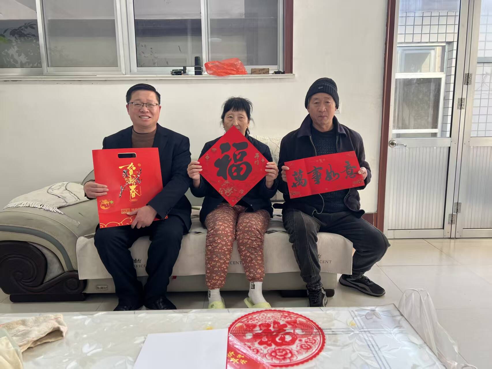 在安丘市,安丘市志愿服务联合会的志愿者们携带米面油等生活物资,走访困难群众100多户,为大家带来社会关爱,并送上新年祝福。2月13日,安丘市志愿服务联合会秘书长孙焕文携带面粉、鸡蛋、蔬菜、福字等到结对帮扶对象残疾人杨春萍家进行看望,为其送上马年新春的祝福。