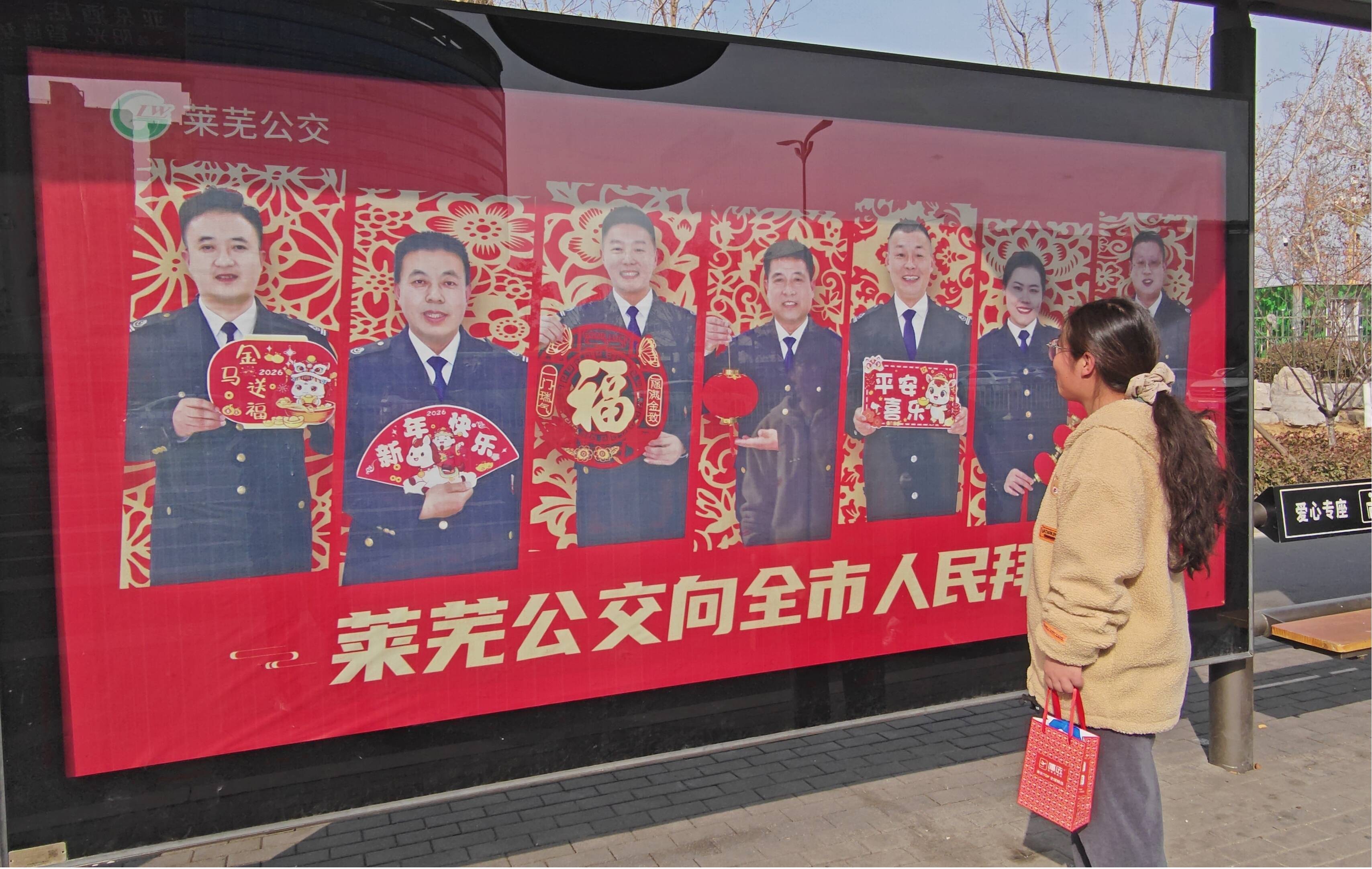 今年,等车也成了一件充满惊喜与期待的事。在政府广场、茂业商圈、花园路大润发超市等城市活力地标,一组组火红亮眼的“明星驾驶员贺岁候车亭”全新登场。平日里沉稳驾驶的“城市摆渡人”,此刻化身为您最熟悉的“送福使者”,在喜庆的候车亭,向每一位过往市民展露笑颜、传递祝愿。