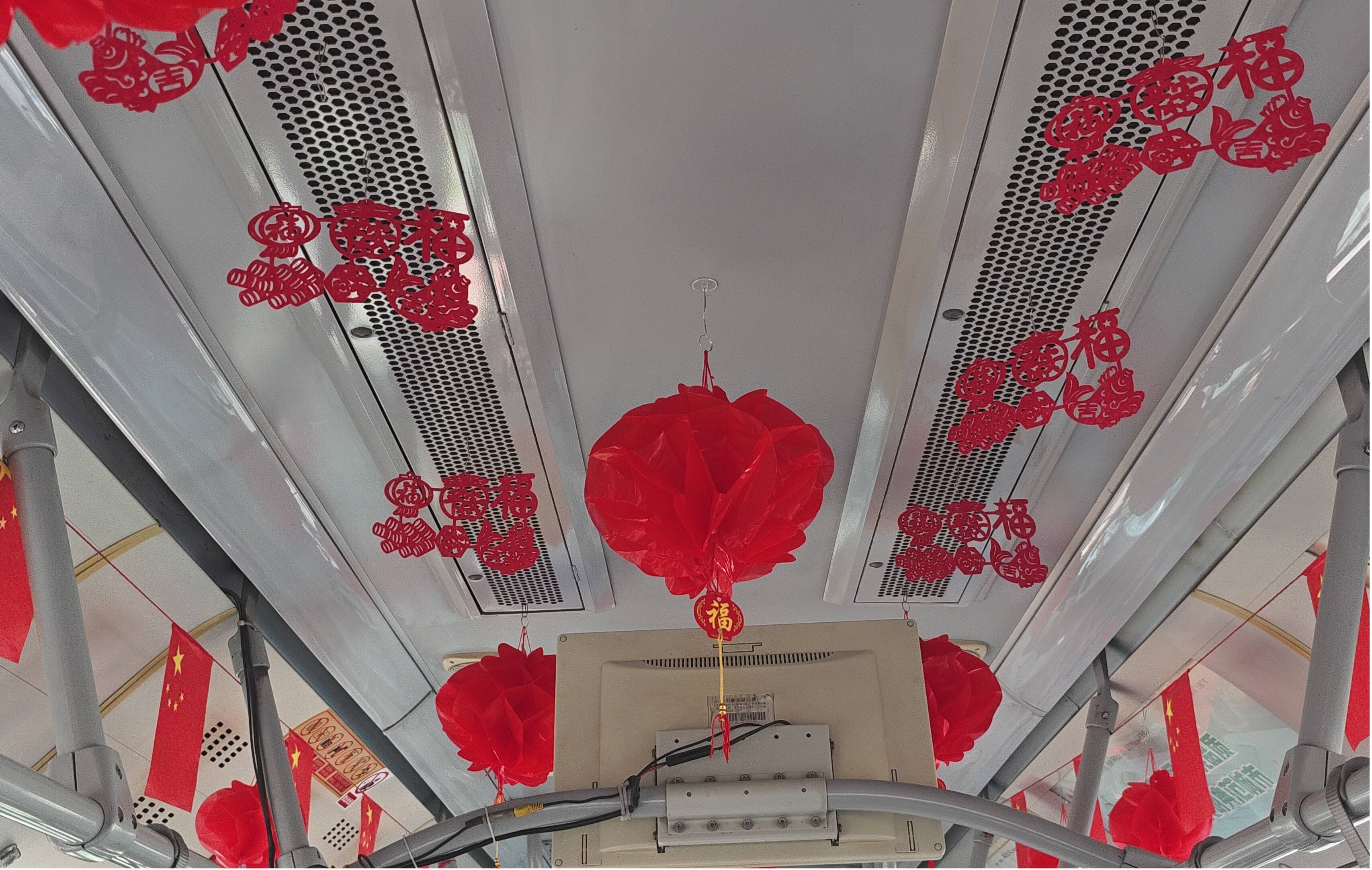 踏上这趟“新春专列”,新春的祝福便从车门开始蔓延。车窗上是寓意吉祥的剪纸,拉杆挂上喜庆的红色“新衣”,车门是满含新春祝福的对联,这不仅仅是一辆公交车,更是一座满载着祝福与欢声笑语的“移动新春乐园”。